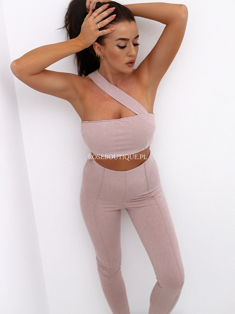 Pudrowo-różowy komplet top + spodnie