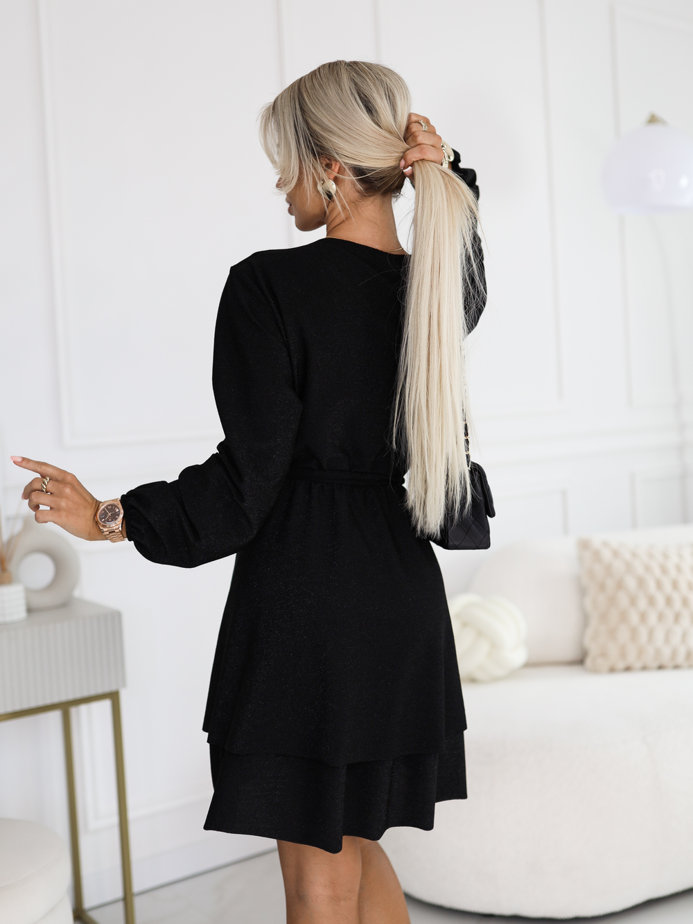 Sukienka z błyszczącego brokatowego materiału to wyjątkowy hit sezonu. Kopertowy dekolt, elastyczna talia z paskiem oraz rozkloszowany dół z falbanami podkreślają sylwetkę i dodają lekkości. Miękka, elastyczna tkanina i długie rękawy zapewniają wygodę i efektowny wygląd na każdej imprezie.