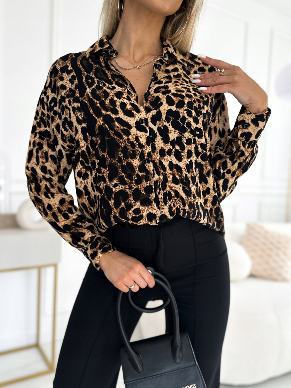 Przepiękna, stylowa i kobieca luźna koszula z najmodniejszym w tym sezonie zwierzęcym wzorem panterki. Wygodny fason oversize zapewnia komfort oraz świetny look. Koszula jest z przodu zapinana na guziki, z kołnierzykiem przy szyi oraz długimi rękawami zakończonymi mankietami na guzik. Wykonana z wysokiej jakości, lekko elastycznego, bawełnianego materiału, dobrze się nosi i świetnie leży. Idealna propozycja na różne okazje, do pracy, szkoły, bądź na co dzień. Doskonale komponuje się zarówno w zestawieniu eleganckim, jak i casualowym.