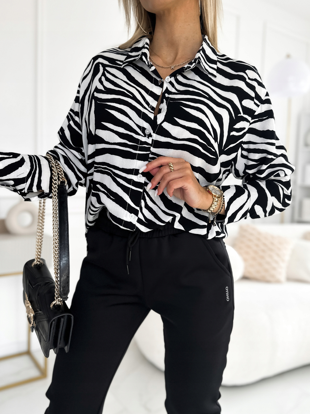 Przepiękna, stylowa i kobieca luźna koszula z najmodniejszym w tym sezonie zwierzęcym wzorem zebry. Wygodny fason oversize zapewnia komfort oraz świetny look. Koszula z przodu zapinana na guziki, z kołnierzykiem przy szyi oraz długimi rękawami zakończonymi mankietami na guzik. Wykonana z wysokiej jakości, lekko elastycznego, bawełnianego materiału, dobrze się nosi i świetnie leży. Idealna propozycja na różne okazje, do pracy, szkoły, bądź na co dzień. Doskonale komponuje się zarówno w zestawieniu eleganckim, jak i casualowym.