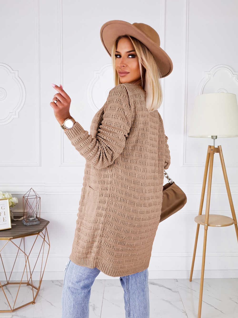 Piękny, ponadczasowy kardigan - narzutka, niezwykle kobiecy i stylowy. Wykonany z super jakości, mięsistego, dzianinowego materiału, charakteryzuje się stylowym ażurowym wzorem i praktycznymi kieszeniami po bokach. Luźniejszy, przedłużany fason oraz długie rękawy zapewniają komfort i elegancję. Kardigan jest ciepły, miękki i miły w dotyku. Starannie wykonany, świetnie się układa, dodając uroku każdej stylizacji.
