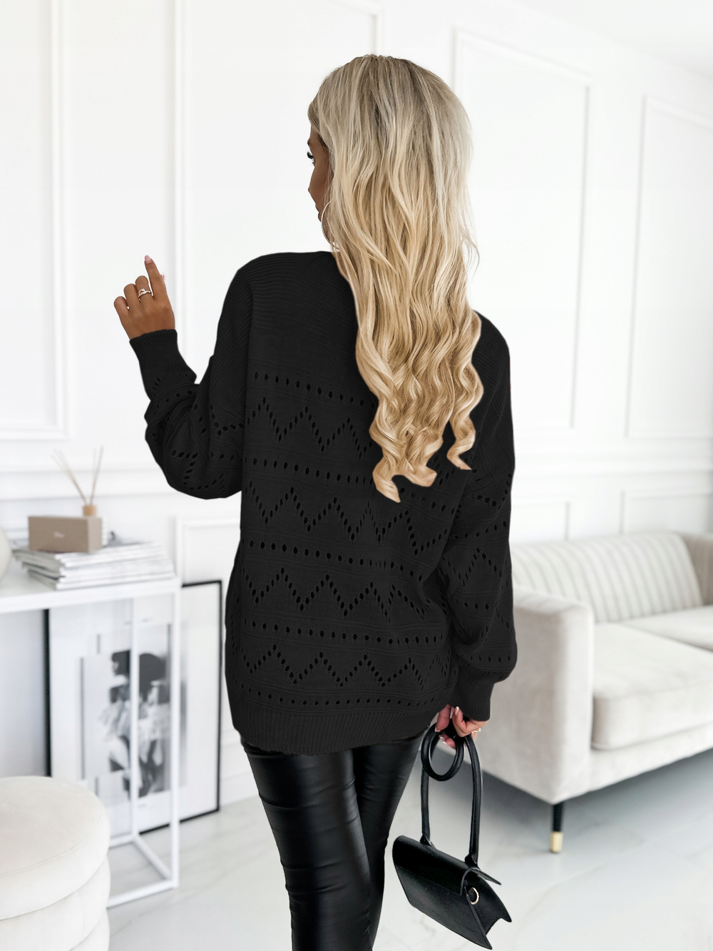 Fenomenalny, kobiecy i luźny sweterek to idealny dodatek do każdej garderoby. Stylowy, lekko ażurowy wzór dodaje mu elegancji, a długie rękawy i okrągłe wycięcie przy szyi zapewniają komfort i modny wygląd. Luźniejszy fason sprawia, że sweterek pięknie się układa i jest super wygodny w noszeniu. Wykonany z wysokogatunkowego, miękkiego i elastycznego materiału, doskonale się naciąga i dopasowuje do sylwetki, prezentując się wprost idealnie. Jego uniwersalny charakter czyni go świetną bazą do wielu stylizacji, podkreślając zmysłowość i kobiecość każdej kobiety.