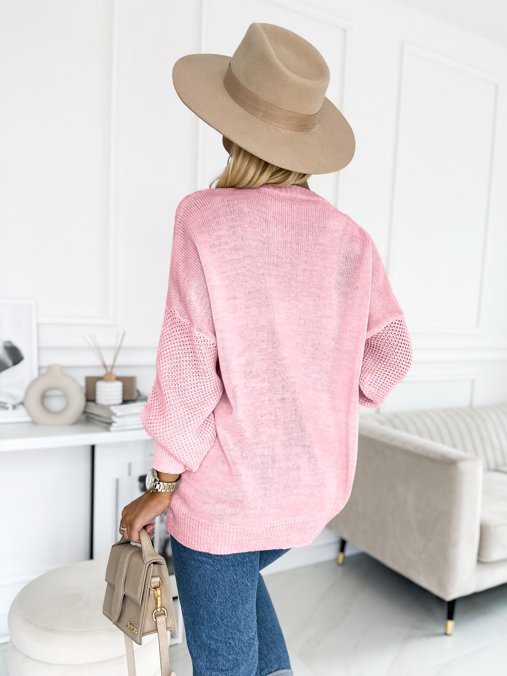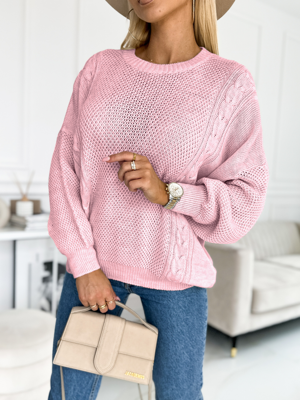 Fenomenalny, kobiecy sweterek z ozdobnym warkoczowym splotem po bokach i gładkim tyłem to idealny wybór na każdą okazję. Luźniejszy krój z okrągłym dekoltem i długimi rękawami zapewnia komfort oraz swobodę ruchów. Wykonany z miękkiego, elastycznego materiału, pięknie dopasowuje się do sylwetki i stanowi doskonałą bazę zarówno do eleganckich, jak i codziennych stylizacji.