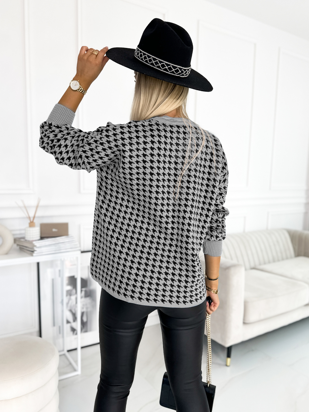 Fenomenalny, luźny, kobiecy sweterek z modnym, ponadczasowym wzorem w pepitkę to must-have w każdej szafie. Sweterek posiada długie rękawy i okrągły dekolt, co nadaje mu klasycznego charakteru. Luźny, wygodny fason zapewnia komfort i swobodę ruchów, a wykonanie z wysokogatunkowego, miękkiego i elastycznego materiału gwarantuje, że sweterek doskonale naciąga się i dopasowuje do ciała, prezentując się idealnie. Ten uniwersalny sweterek jest świetną bazą do wielu stylizacji, sprawdzi się zarówno na co dzień, jak i na bardziej formalne okazje, dodając szyku i elegancji każdemu outfitowi.