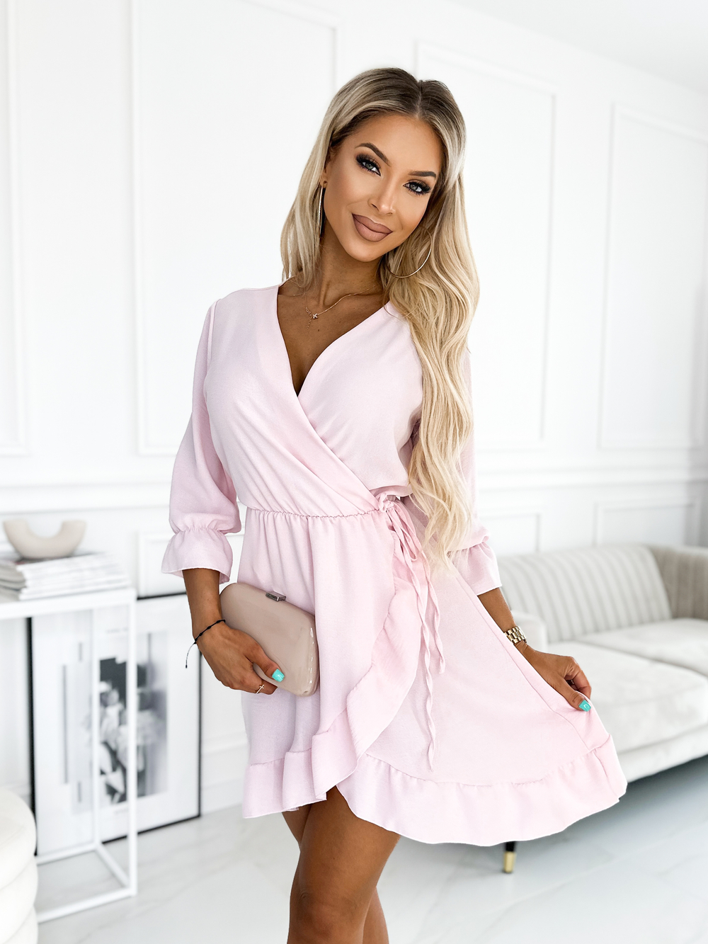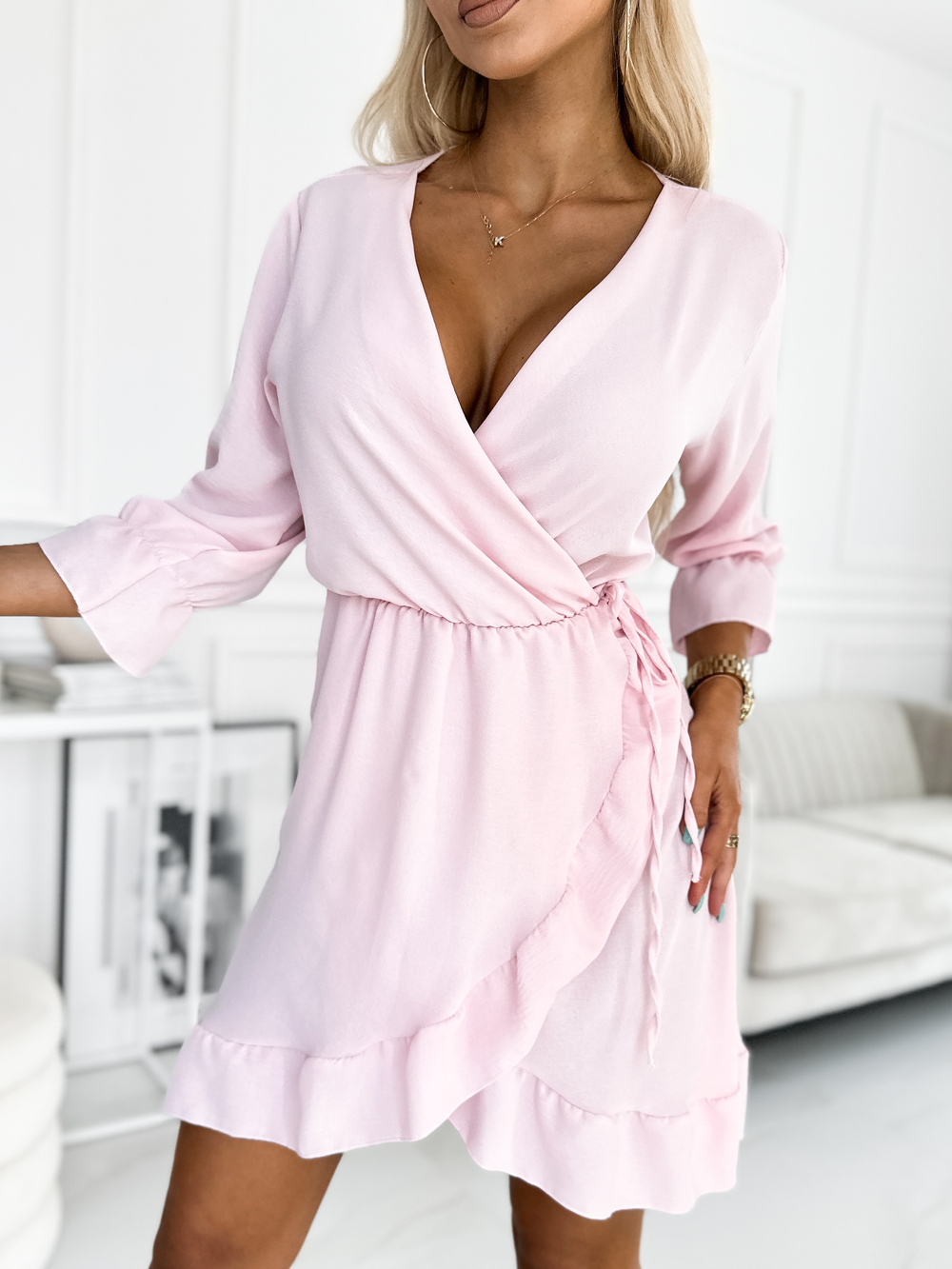 Blady róż sukienka z falbaną i kopertowym dekoltem Nicole