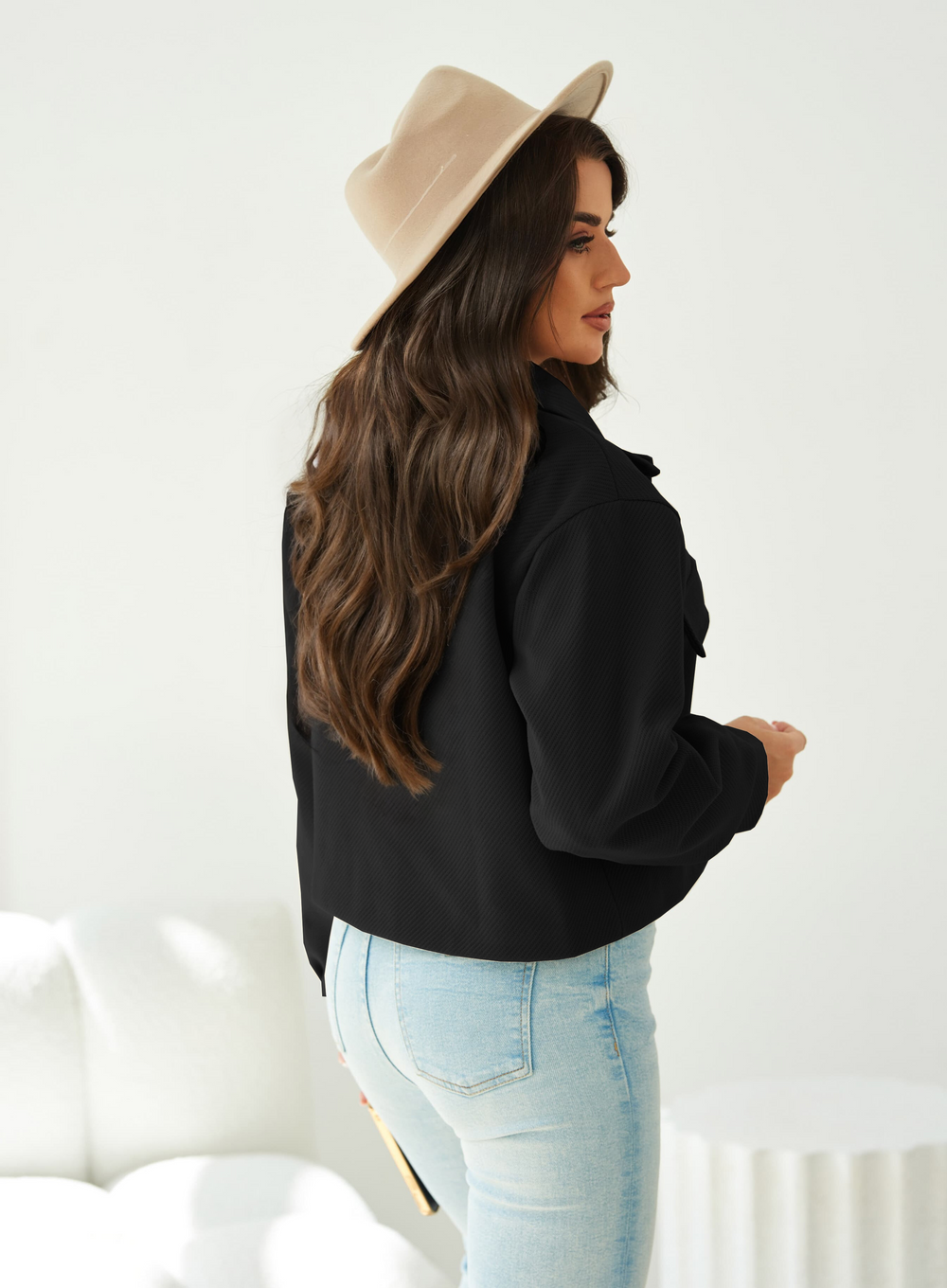 Krótka kurtka z lekko prążkowanego materiału to idealny wybór dla kobiet szukających stylu i komfortu. Zapinana na guziki, z klasycznym kołnierzykiem i praktycznymi kieszeniami z przodu, łączy w sobie elegancję z funkcjonalnością. Subtelne prążki nadają kurtce nowoczesnego charakteru, dzięki czemu sprawdzi się zarówno w casualowych, jak i bardziej wyrafinowanych stylizacjach. To wszechstronny element garderoby, który doda Twoim codziennym stylizacjom modnego akcentu.
