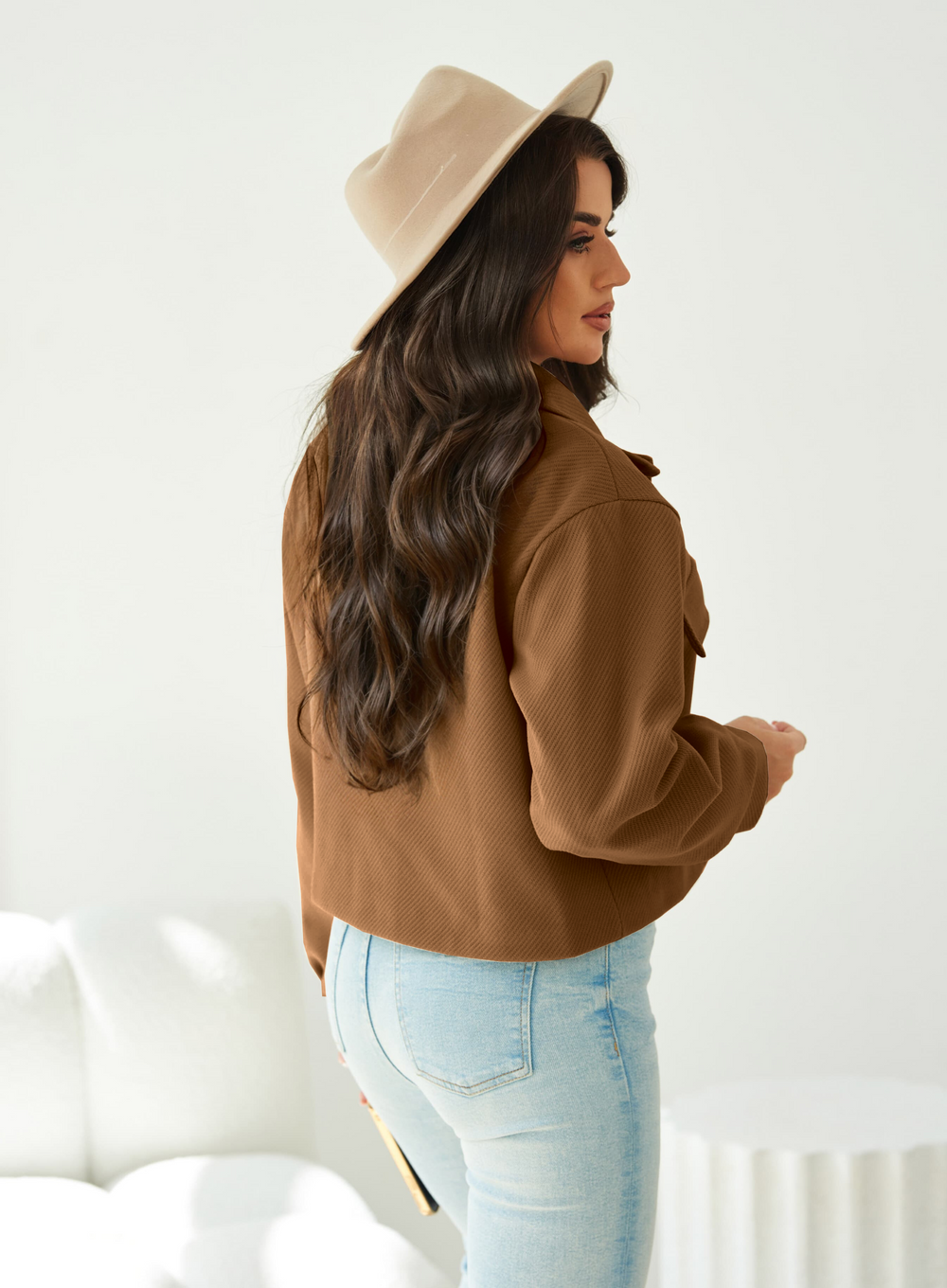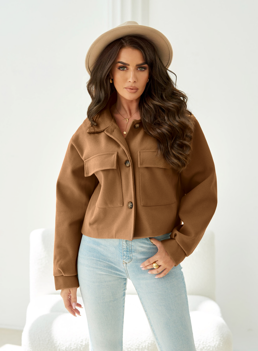 Krótka kurtka z lekko prążkowanego materiału to idealny wybór dla kobiet szukających stylu i komfortu. Zapinana na guziki, z klasycznym kołnierzykiem i praktycznymi kieszeniami z przodu, łączy w sobie elegancję z funkcjonalnością. Subtelne prążki nadają kurtce nowoczesnego charakteru, dzięki czemu sprawdzi się zarówno w casualowych, jak i bardziej wyrafinowanych stylizacjach. To wszechstronny element garderoby, który doda Twoim codziennym stylizacjom modnego akcentu.
