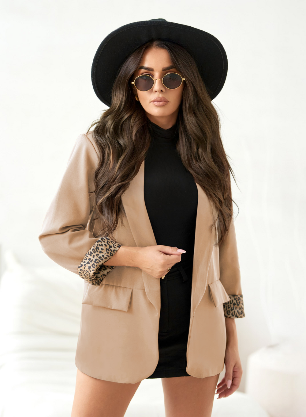 Gładka marynarka z podszewką w panterkę to stylowy element garderoby, który łączy klasykę z odrobiną drapieżnego charakteru. Jej klasyczny fason z poduszkami na ramionach podkreśla sylwetkę i dodaje elegancji. Uniwersalny rozmiar sprawia, że marynarka dopasowuje się do różnych sylwetek. Możliwość podwinięcia rękawów, które uwidaczniają wzór podszewki, dodaje marynarce modnego, nieco zadziornego akcentu. To wszechstronny wybór, idealny zarówno do formalnych, jak i bardziej casualowych stylizacji, pozwalający na subtelne wyrażenie indywidualności.