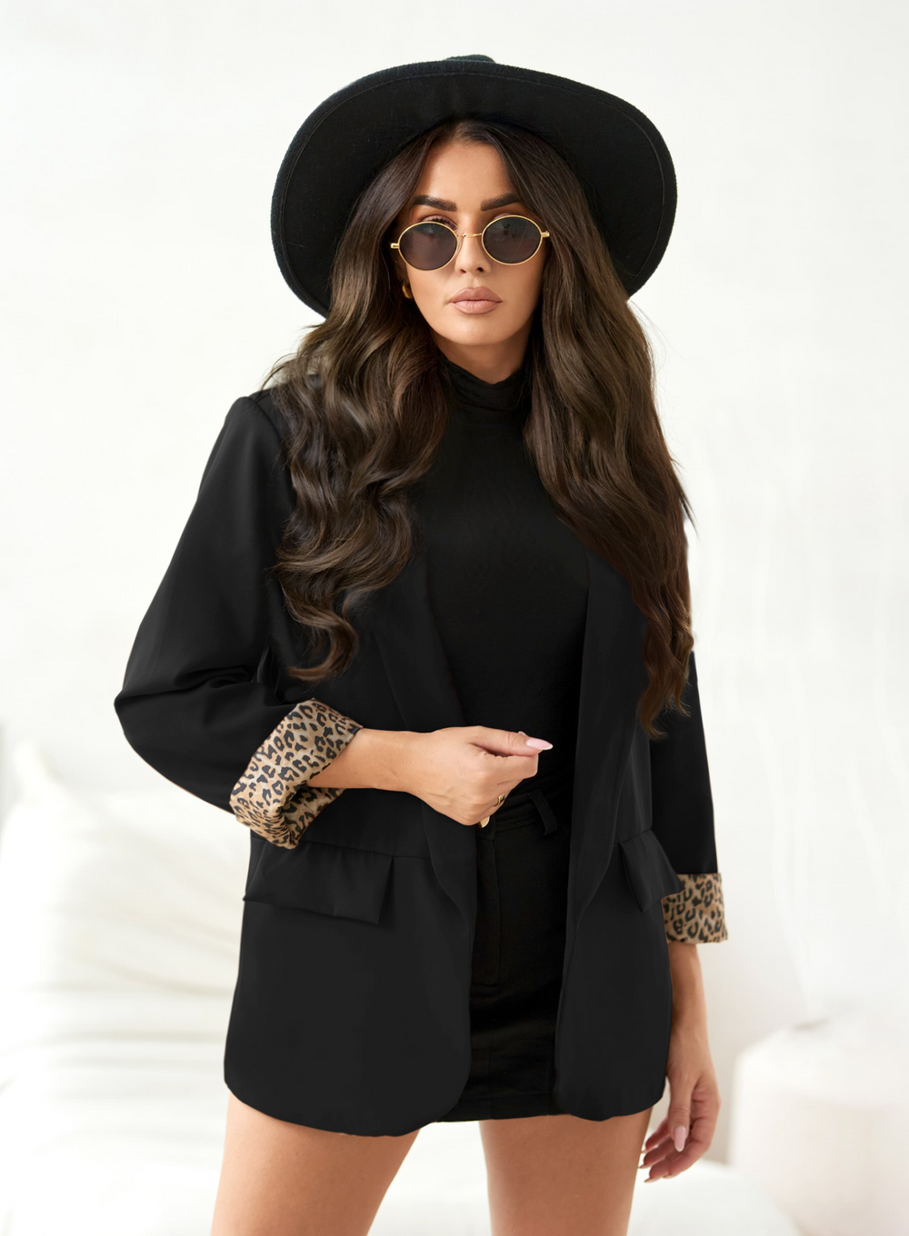 Gładka marynarka z podszewką w panterkę to stylowy element garderoby, który łączy klasykę z odrobiną drapieżnego charakteru. Jej klasyczny fason z poduszkami na ramionach podkreśla sylwetkę i dodaje elegancji. Uniwersalny rozmiar sprawia, że marynarka dopasowuje się do różnych sylwetek. Możliwość podwinięcia rękawów, które uwidaczniają wzór podszewki, dodaje marynarce modnego, nieco zadziornego akcentu. To wszechstronny wybór, idealny zarówno do formalnych, jak i bardziej casualowych stylizacji, pozwalający na subtelne wyrażenie indywidualności.