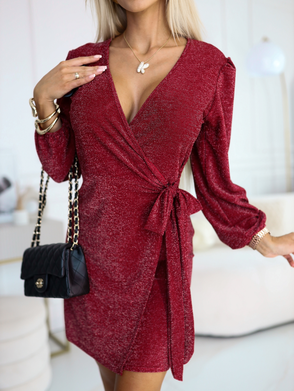 Krótka, błyszcząca sukienka z kopertowym dekoltem to idealna propozycja na wyjątkowe wyjścia. Elegancki fason podkreśla sylwetkę, a z przodu ozdobiona jest wiązaną kokardą, która dodaje uroku i oryginalności. Ta sukienka to idealne połączenie stylu i komfortu, przyciągająca wzrok i idealna na imprezy i wieczorne wyjścia.