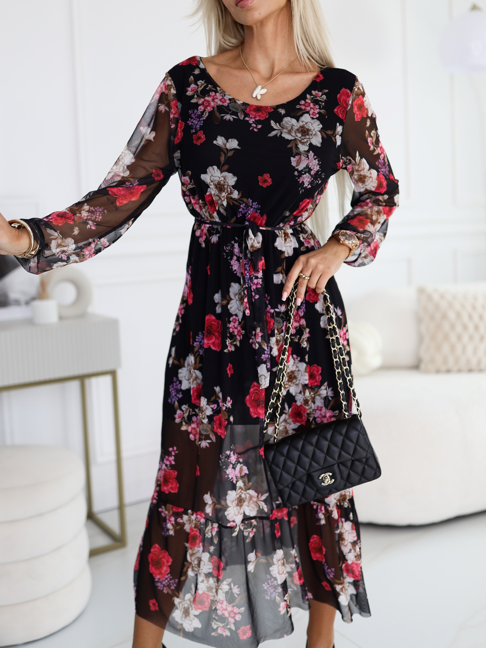 Zwiewna, dłuższa sukienka wykonana z lekkiego, siateczkowego materiału to idealna propozycja na jesień. Ozdobiona pięknym kwiatowym wzorem w jesiennych barwach, przyciąga uwagę swoją delikatnością i elegancją. Sukienka posiada podszewkę, co zapewnia komfort noszenia, a elastyczna gumka w pasie oraz dodatkowy pasek podkreślają talię. Dół sukienki wykończony ozdobną falbaną dodaje lekkości i romantycznego charakteru. Długie rękawy zakończone gumką dopełniają całości, tworząc subtelną, a zarazem stylową kreację na chłodniejsze dni.