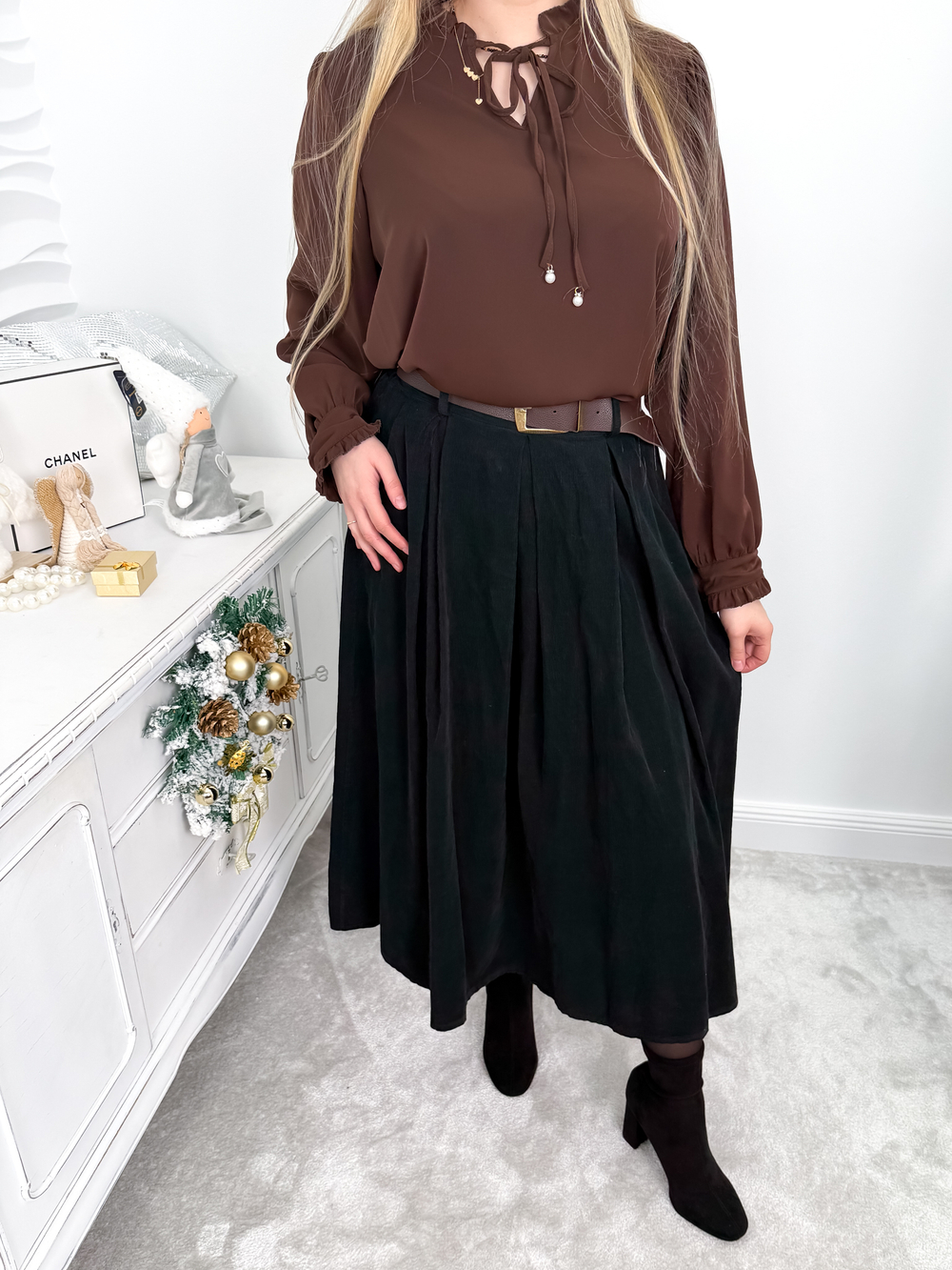 Sztruksowa spódnica midi o rozkloszowanym fasonie to połączenie stylu i komfortu. Wykonana z miękkiego, sztruksowego materiału, doskonale sprawdzi się w jesiennych stylizacjach. Wyposażona w praktyczne kieszenie i dopasowany pasek w zestawie, pięknie podkreśla talię. Elastyczna gumka z tyłu pasa gwarantuje wygodę noszenia i idealne dopasowanie. Uniwersalny design sprawia, że spódnica świetnie komponuje się zarówno z casualowymi, jak i bardziej eleganckimi elementami garderoby.