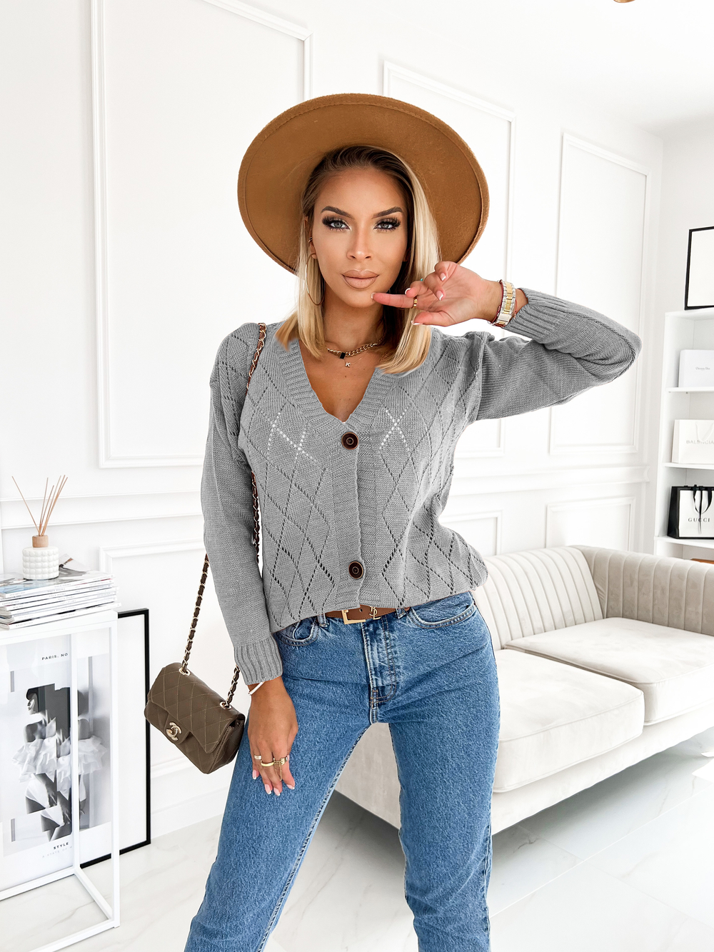 Szary sweter w romby z guzikami