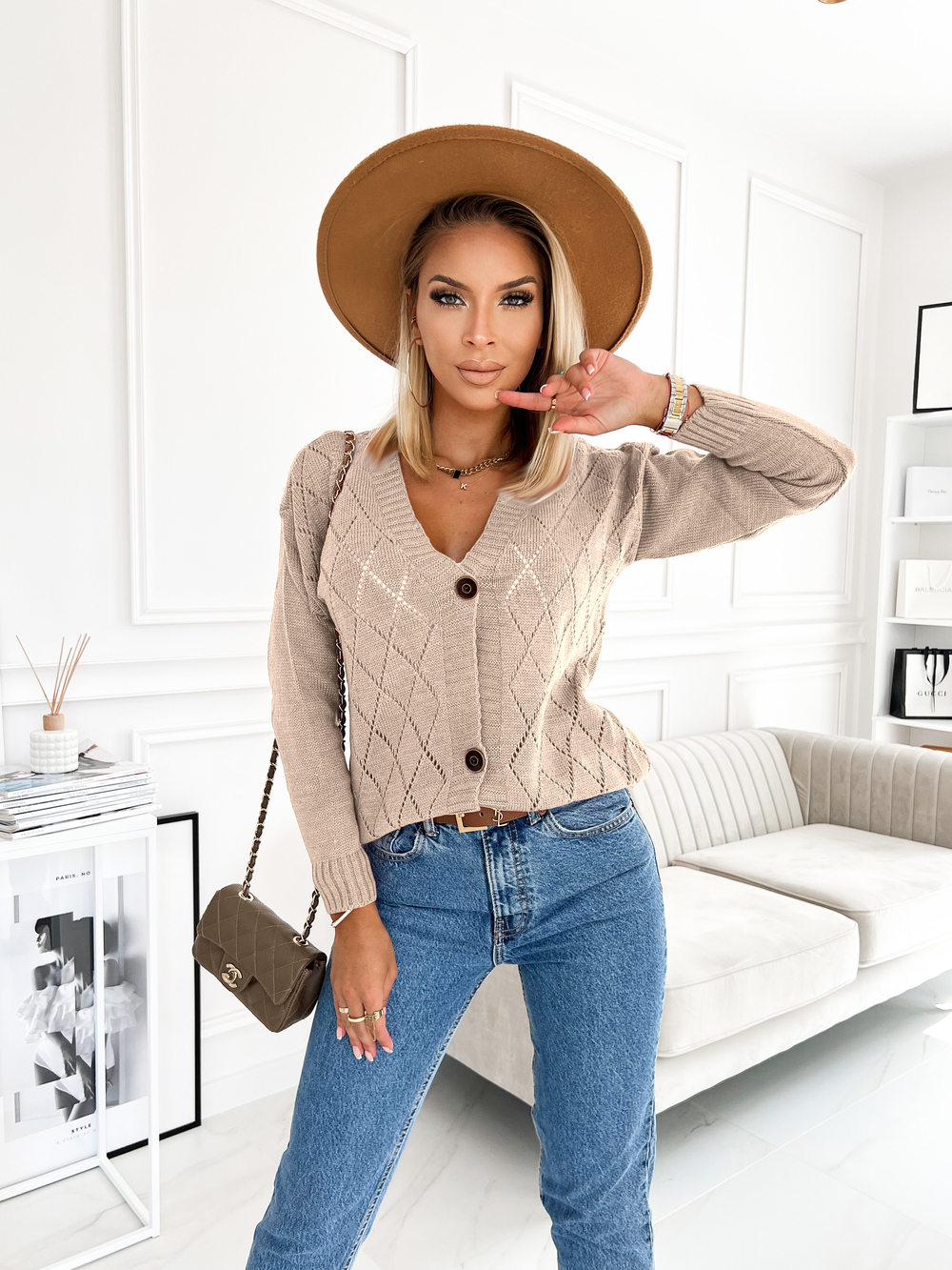 Przepiękny, kobiecy sweterek - kardigan, który zachwyca swoim stylem i komfortem. Zapinany na duże guziki, z przodu oraz na rękawach zdobiony stylowym, plecionym warkoczem, nadaje wyjątkowego charakteru. Kuszący dekolt w serek dodaje zmysłowości. Wykonany z wysokiej jakości, mięsistego dzianinowego materiału, jest gruby, ciepły, miękki i miły w dotyku. Bardzo starannie wykonany, pięknie się układa, stanowiąc świetne uzupełnienie każdej jesiennej stylizacji. Idealnie współgra zarówno z miejskim stylem w wersji casualowej, jak i w eleganckich zestawieniach. Doskonała propozycja zarówno do spódniczki, jak i jeansów.