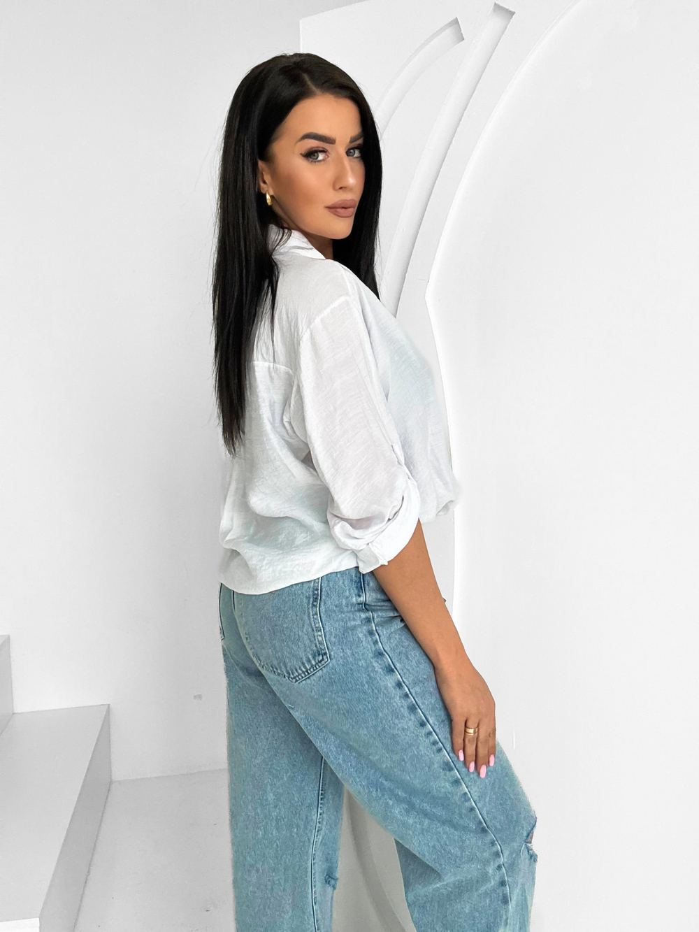 Stylowa koszula z lekko gniecionego materiału to idealny wybór na co dzień i do eleganckich stylizacji. Rękawy 3/4 z możliwością podpięcia zapewniają komfort i swobodę noszenia. Dół stylowo zszyty, imitujący związanie, dodaje modnego akcentu. Zwiewny, wygodny fason doskonale sprawdzi się w każdej garderobie.