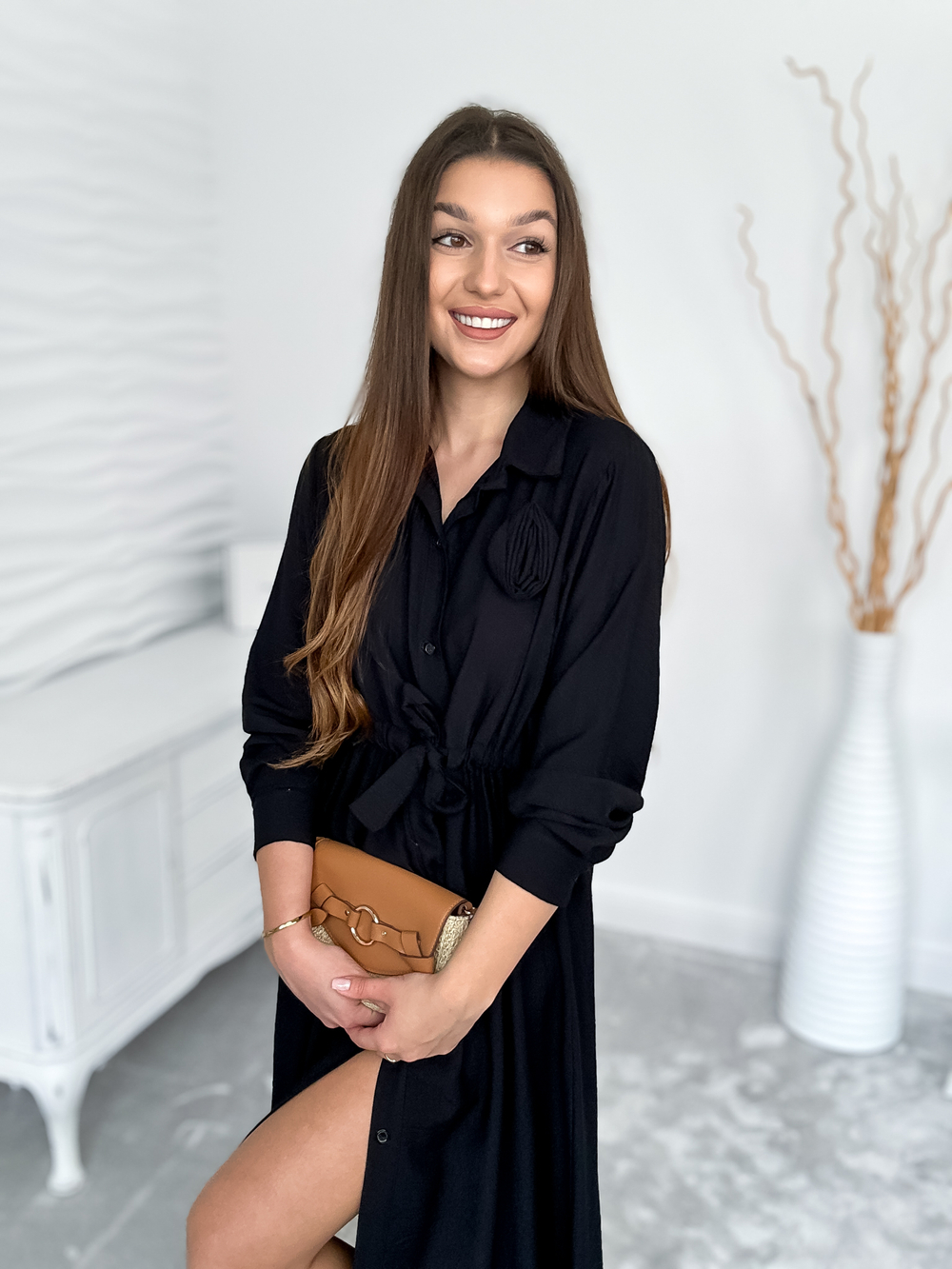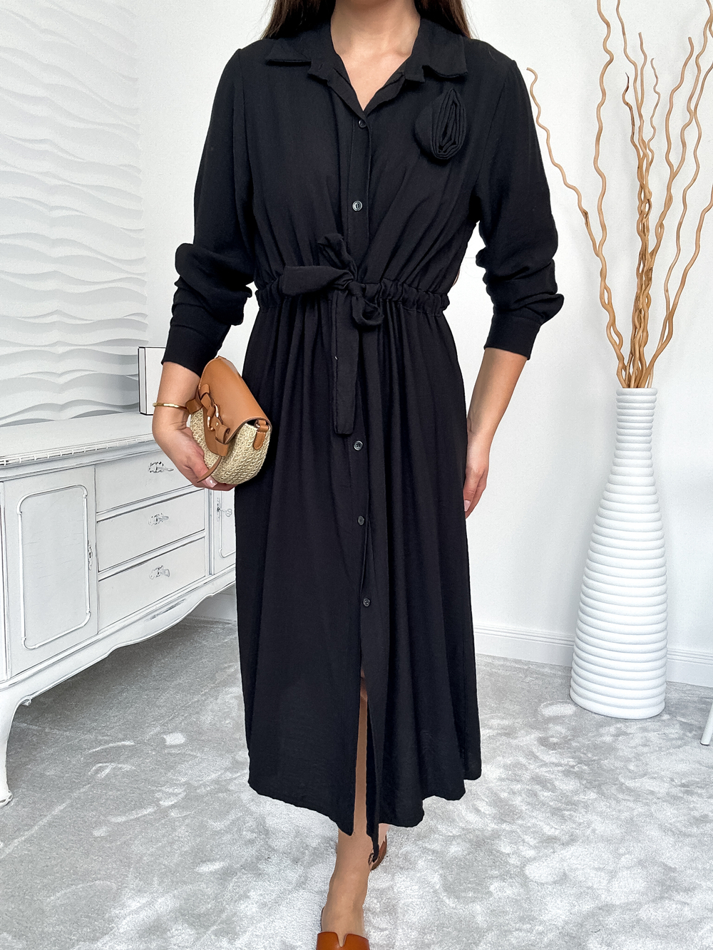 Elegancka sukienka maxi z ozdobną różą i wiązaniem w talii to kobiecy akcent w nowoczesnym wydaniu. Długi rękaw i zapięcie na guziki na całej długości nadają jej klasy i funkcjonalności. Dostępna w różnych kolorach, pozwala dopasować stylizację do każdej okazji.