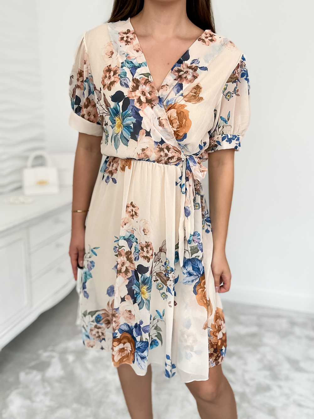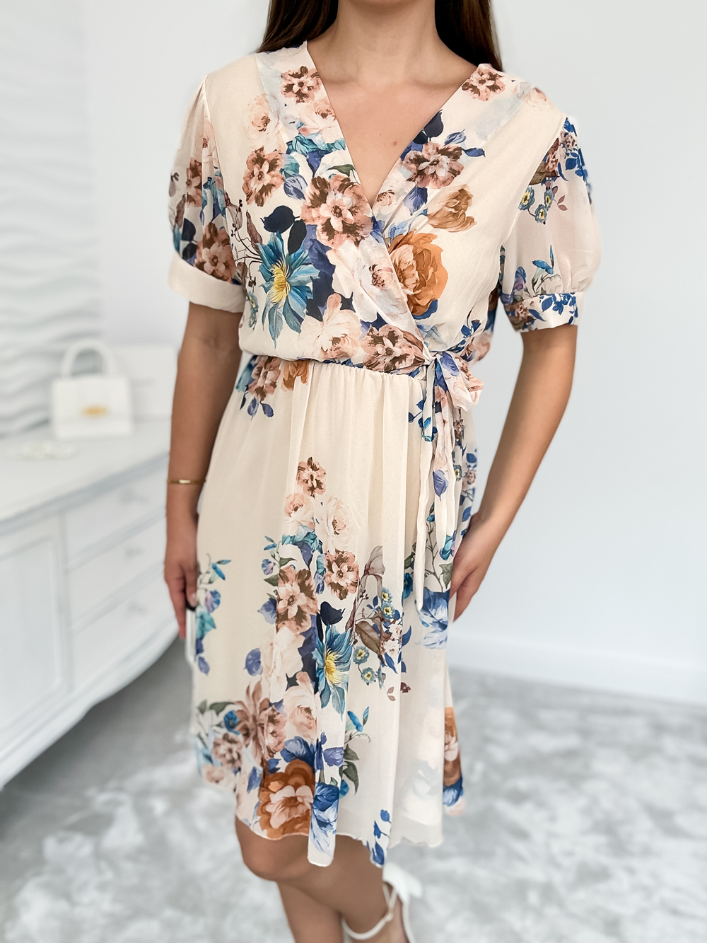 Elegancka sukienka w kwiaty to idealne połączenie kobiecego uroku i wygody. Dekolt w serek subtelnie podkreśla szyję, a elastyczna talia z wiązaniem akcentuje sylwetkę. Krótki rękaw i zwiewny materiał sprawiają, że sprawdzi się zarówno na co dzień, jak i na specjalne okazje.