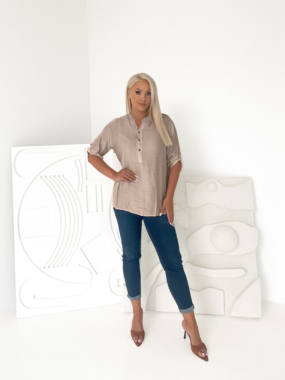 Ciemny beż koszulowa bluzka z guzikami Lana