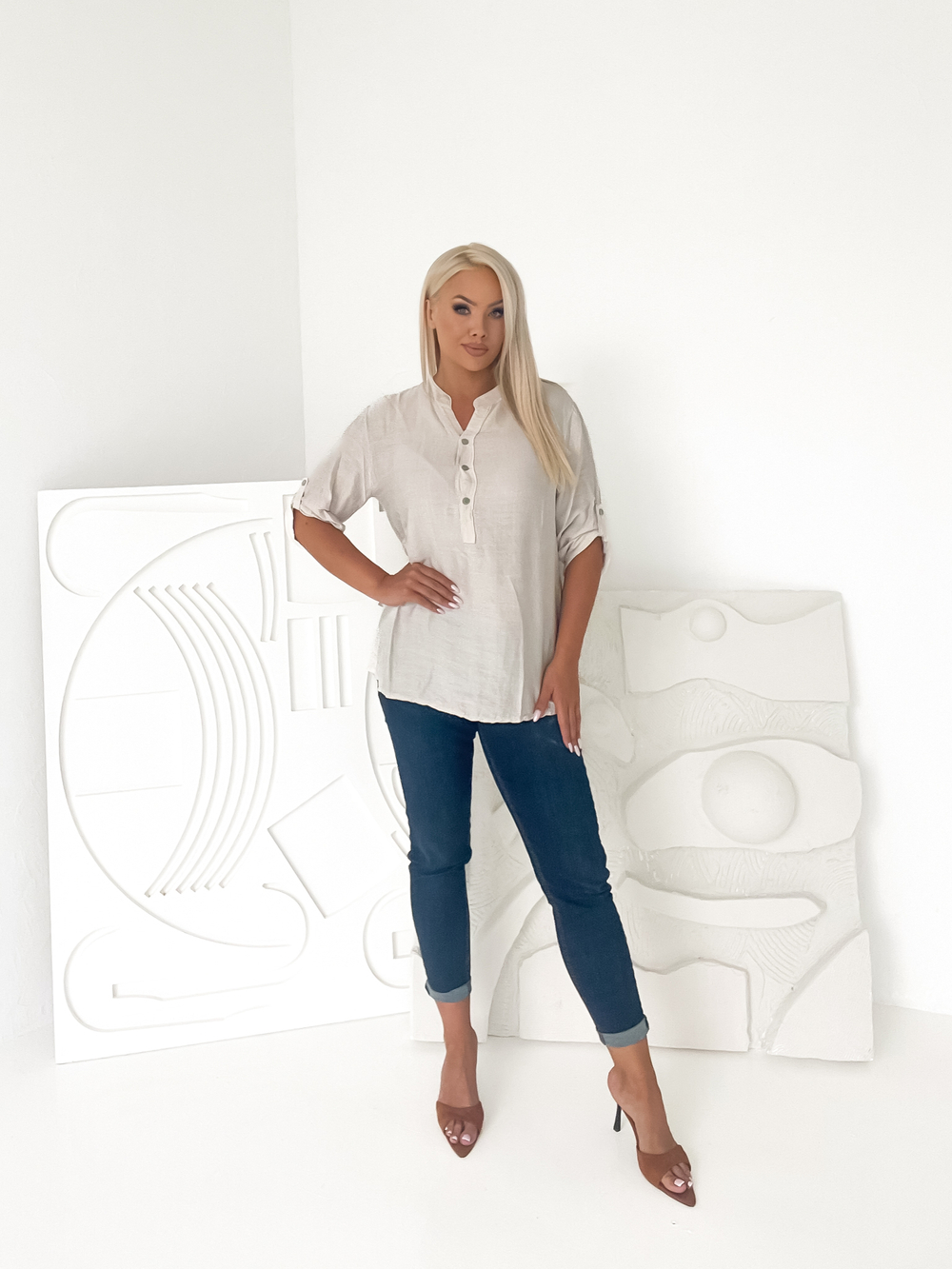 Beżowa koszulowa bluzka z guzikami Lana