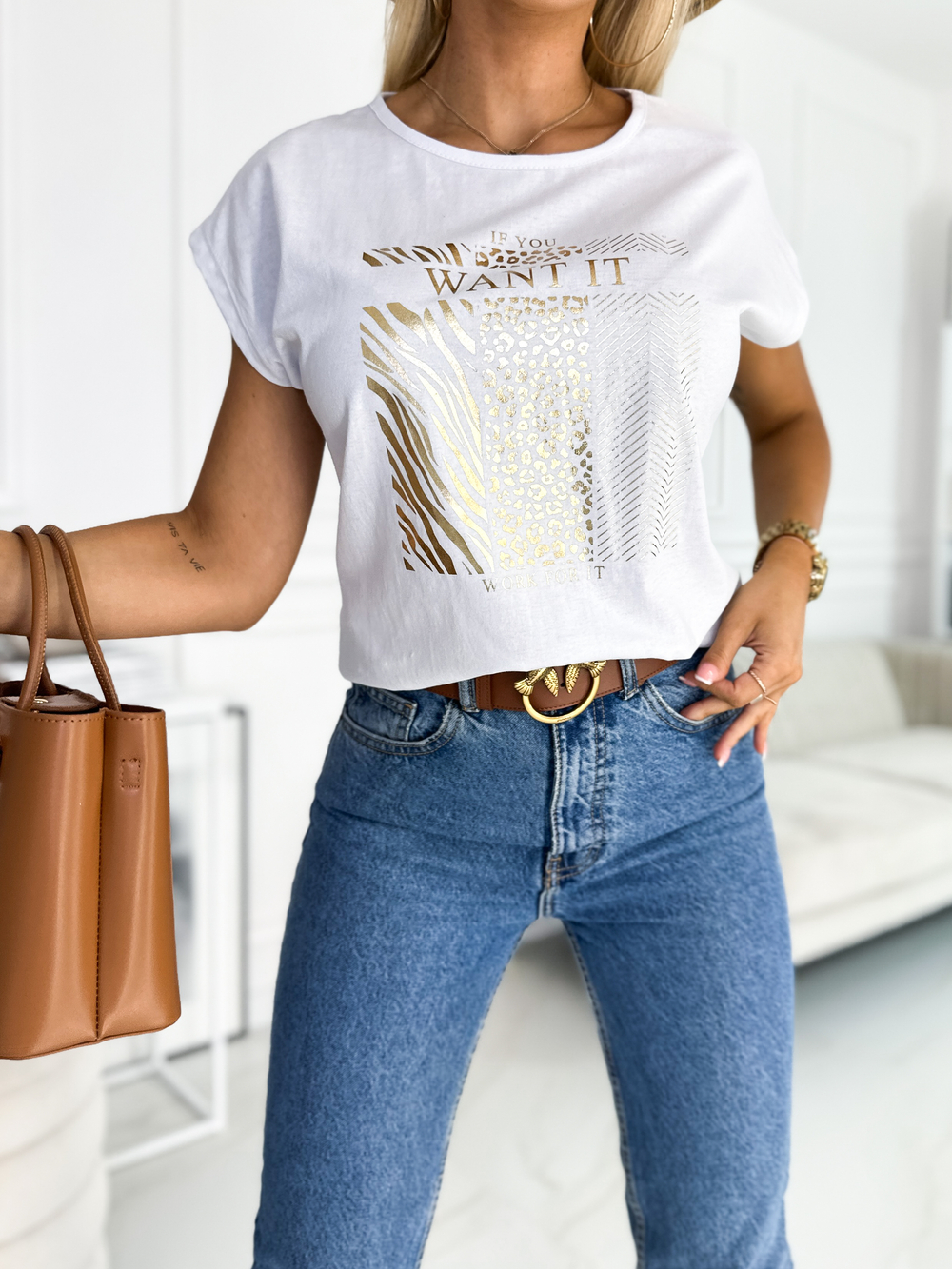 Miękka bluzka z krótkim rękawem i klasycznym okrągłym dekoltem, wykonana w 100% z bawełny, zapewnia komfort na co dzień. Z przodu znajduje się elegancka, złota aplikacja, która dodaje subtelnego blasku każdej stylizacji. Styl minimalistyczny z metalicznym akcentem to silny trend tego roku.
