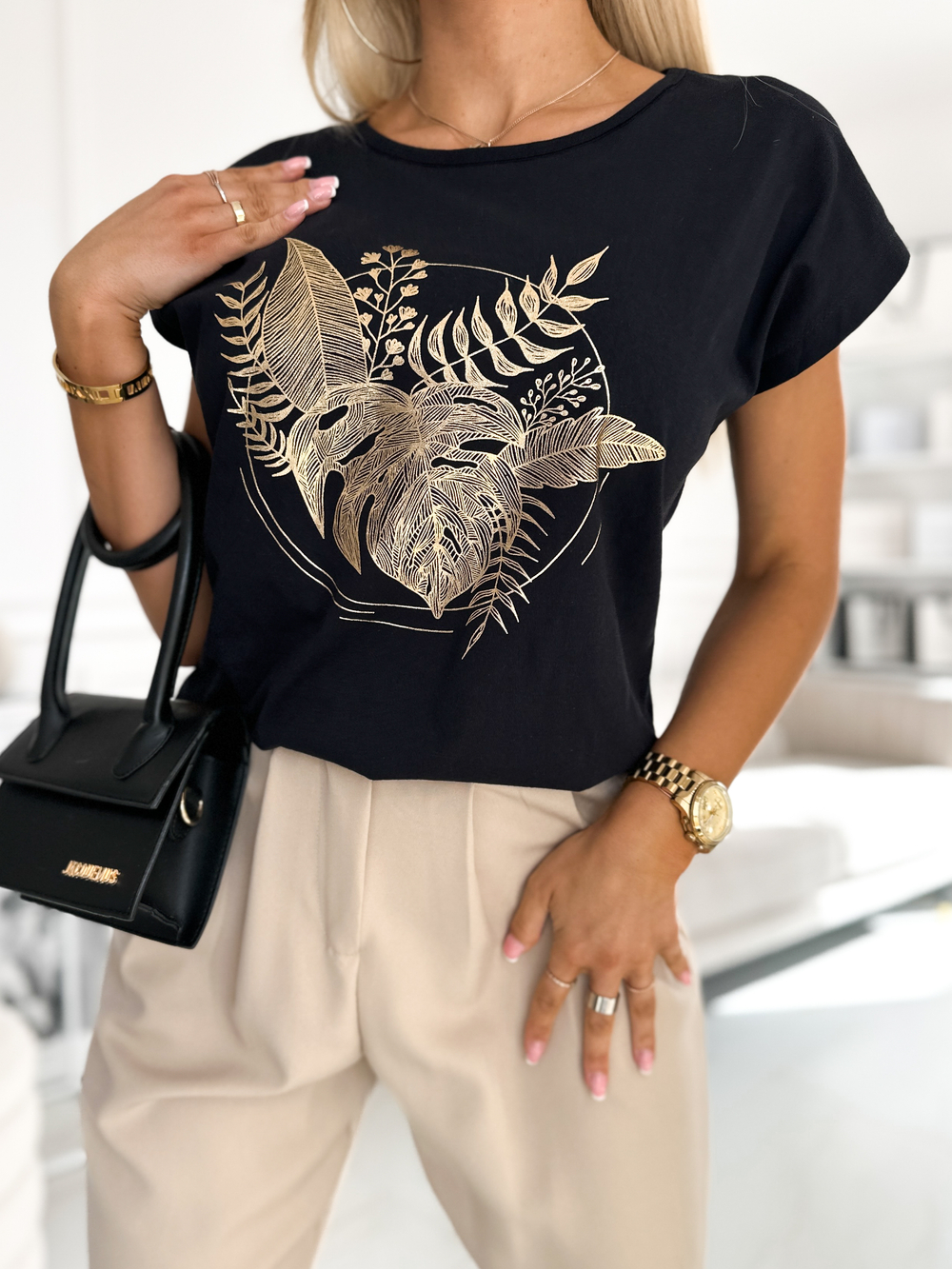 Miękki, klasyczny t‑shirt z krótkim rękawem i okrągłym dekoltem, wykonany w 100% z bawełny — idealny na co dzień. Na przodzie delikatna, złota aplikacja o roślinnym motywie, która dodaje stylowego, minimalistycznego akcentu. T-shirt łączy prostotę z elegancją — ponadczasowa baza garderoby z subtelnym charakterem.