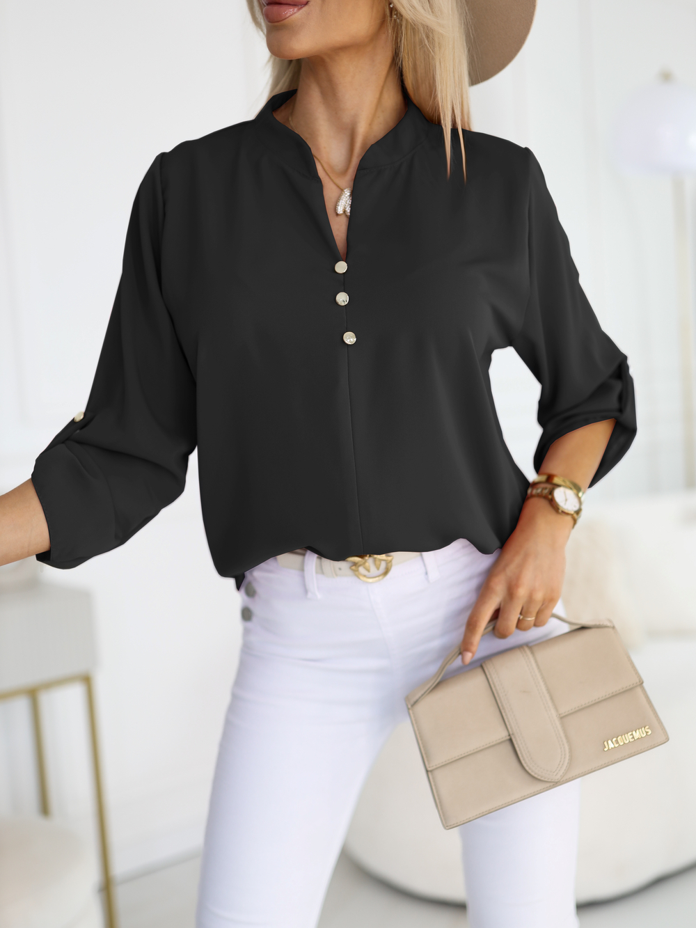 Elegancka bluzka koszulowa z ozdobnymi guzikami przy dekolcie to stylowa i wygodna propozycja na wiele okazji. Rękawy 3/4 z podwinięciem dodają lekkości i swobody. Świetnie sprawdzi się zarówno w codziennych, jak i bardziej formalnych stylizacjach.