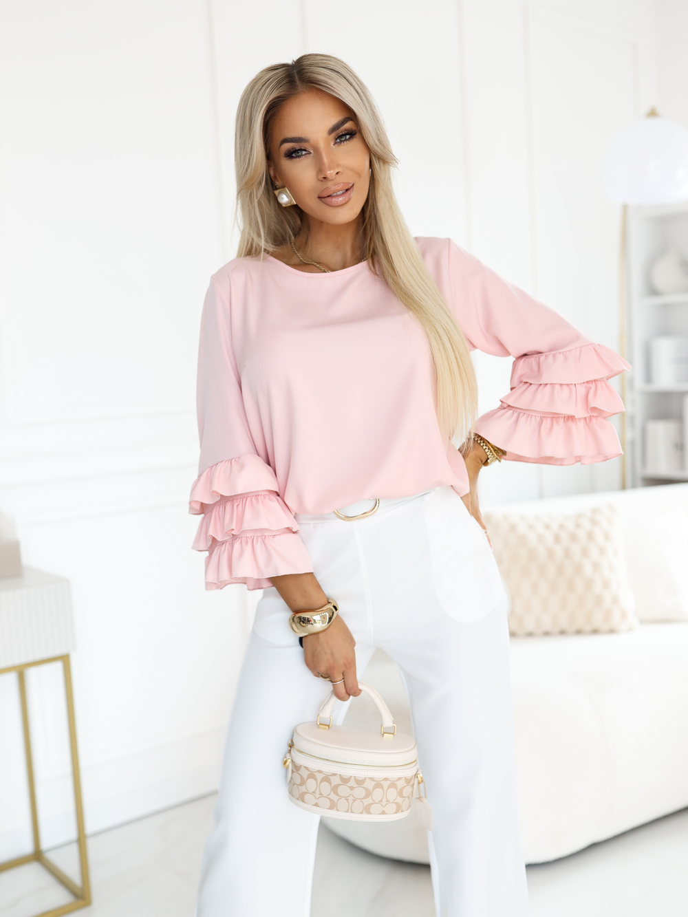 Piękna i elegancka bluzka z delikatnymi falbanami przy rękawach i subtelnym wiązaniem z tyłu tworzy kobiecy i romantyczny look. Okrągły dekolt dodaje klasyki i wygody przez cały dzień. Dostępna w kilku kolorach, pozwala dopasować styl do indywidualnych preferencji.