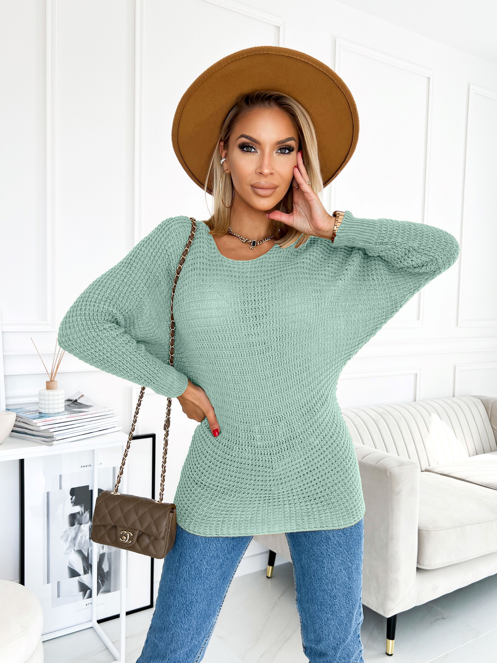 Oto fenomenalny, kobiecy sweterek typu nietoperz, który zachwyca swoim komfortem i luźniejszym fasonem kimona, pięknie układając się na ciele. Posiada okrągłe wycięcie przy szyi oraz długie rękawy, co nadaje mu wyjątkowego uroku i zmysłowości. Wykonany z wysokogatunkowego, miękkiego i elastycznego, lekko ażurowego materiału, ten sweterek jest nie tylko przyjemny w dotyku, ale także doskonale dopasowuje się do sylwetki, prezentując się wprost idealnie. Jego uniwersalny charakter sprawia, że jest świetną bazą do wielu stylizacji, doskonale pasującą do różnych okazji.
