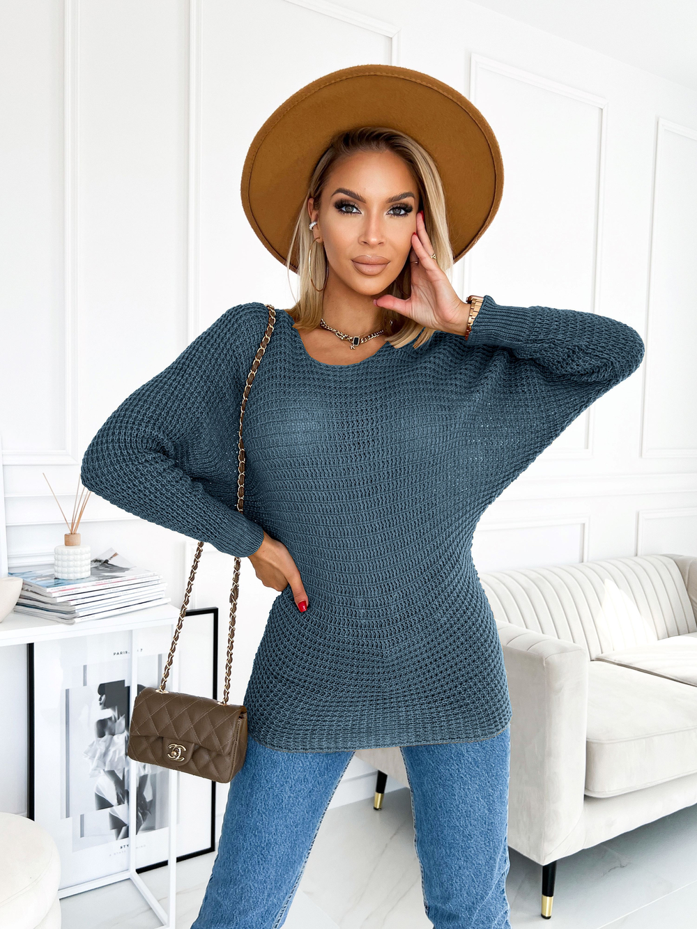 Oto fenomenalny, kobiecy sweterek typu nietoperz, który zachwyca swoim komfortem i luźniejszym fasonem kimona, pięknie układając się na ciele. Posiada okrągłe wycięcie przy szyi oraz długie rękawy, co nadaje mu wyjątkowego uroku i zmysłowości. Wykonany z wysokogatunkowego, miękkiego i elastycznego, lekko ażurowego materiału, ten sweterek jest nie tylko przyjemny w dotyku, ale także doskonale dopasowuje się do sylwetki, prezentując się wprost idealnie. Jego uniwersalny charakter sprawia, że jest świetną bazą do wielu stylizacji, doskonale pasującą do różnych okazji.