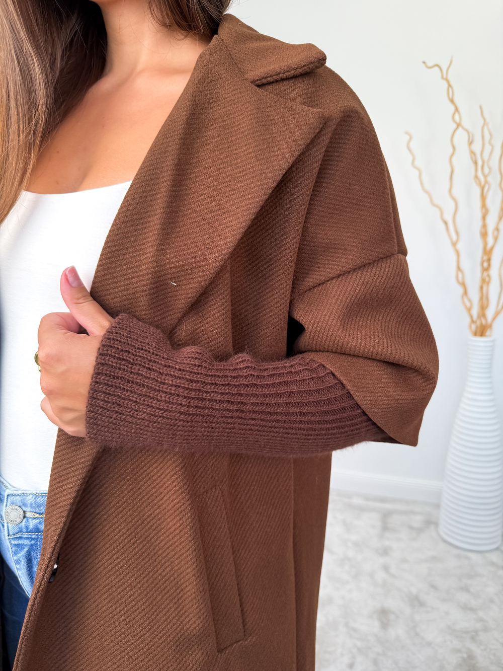 Płaszcz ze sweterkowymi rękawami to połączenie elegancji i wygody. Zapinany z przodu na guziki, z praktycznymi kieszeniami po bokach, sprawdzi się na co dzień i specjalne okazje. Dostępny w kilku kolorach do wyboru, idealnie dopasuje się do Twojego stylu.