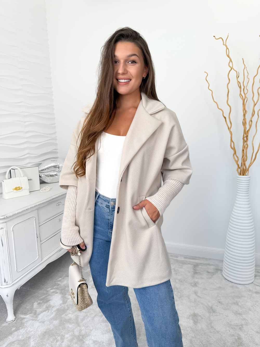 Płaszcz ze sweterkowymi rękawami to połączenie elegancji i wygody. Zapinany z przodu na guziki, z praktycznymi kieszeniami po bokach, sprawdzi się na co dzień i specjalne okazje. Dostępny w kilku kolorach do wyboru, idealnie dopasuje się do Twojego stylu.
