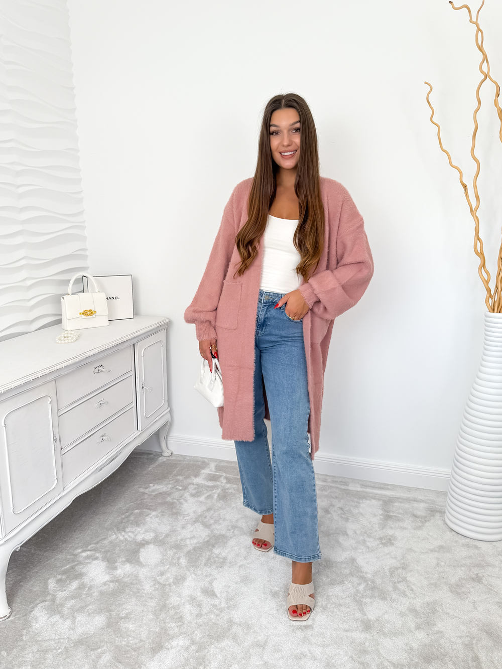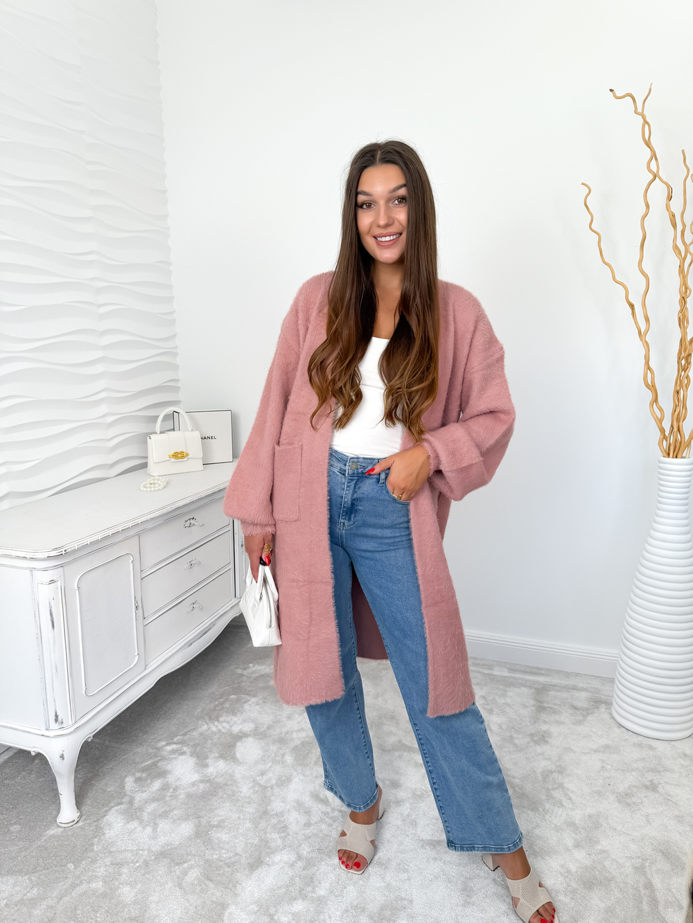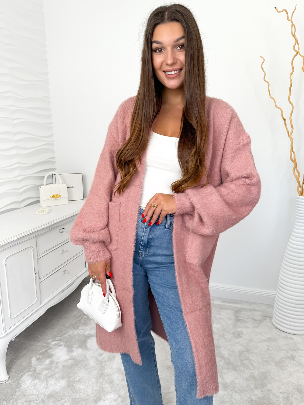 Różowy długi kardigan fluffy