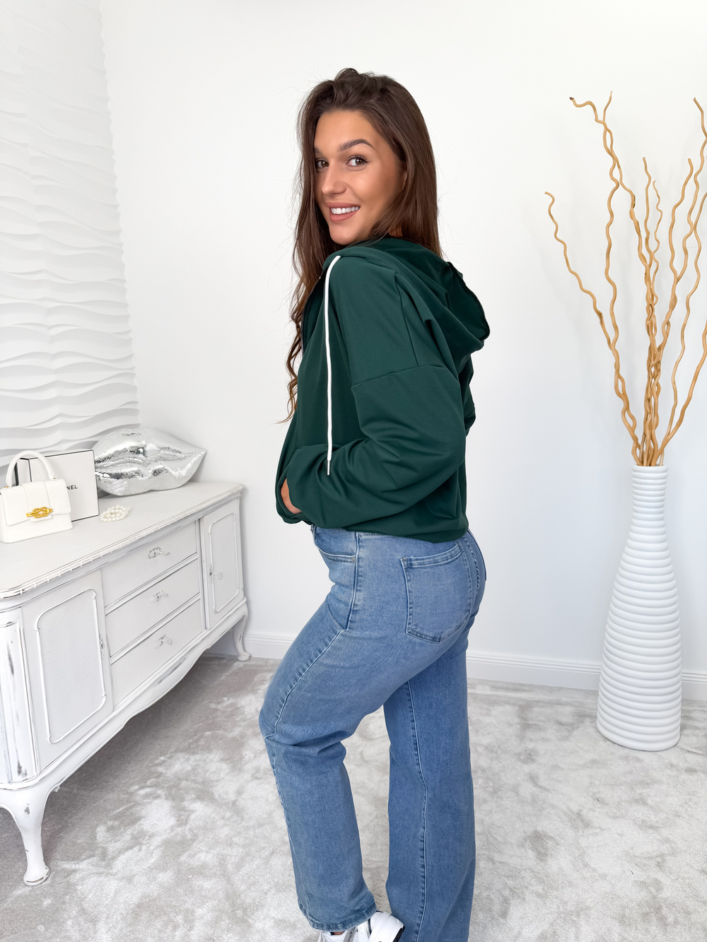 Bluza dresowa z kapturem o luźniejszym kroju to wygodna i stylowa propozycja na co dzień. Posiada opadające rękawy, elastyczny ściągacz na dole, dwie kieszenie oraz praktyczne zapięcie na zamek. Idealna do casualowych i sportowych stylizacji.