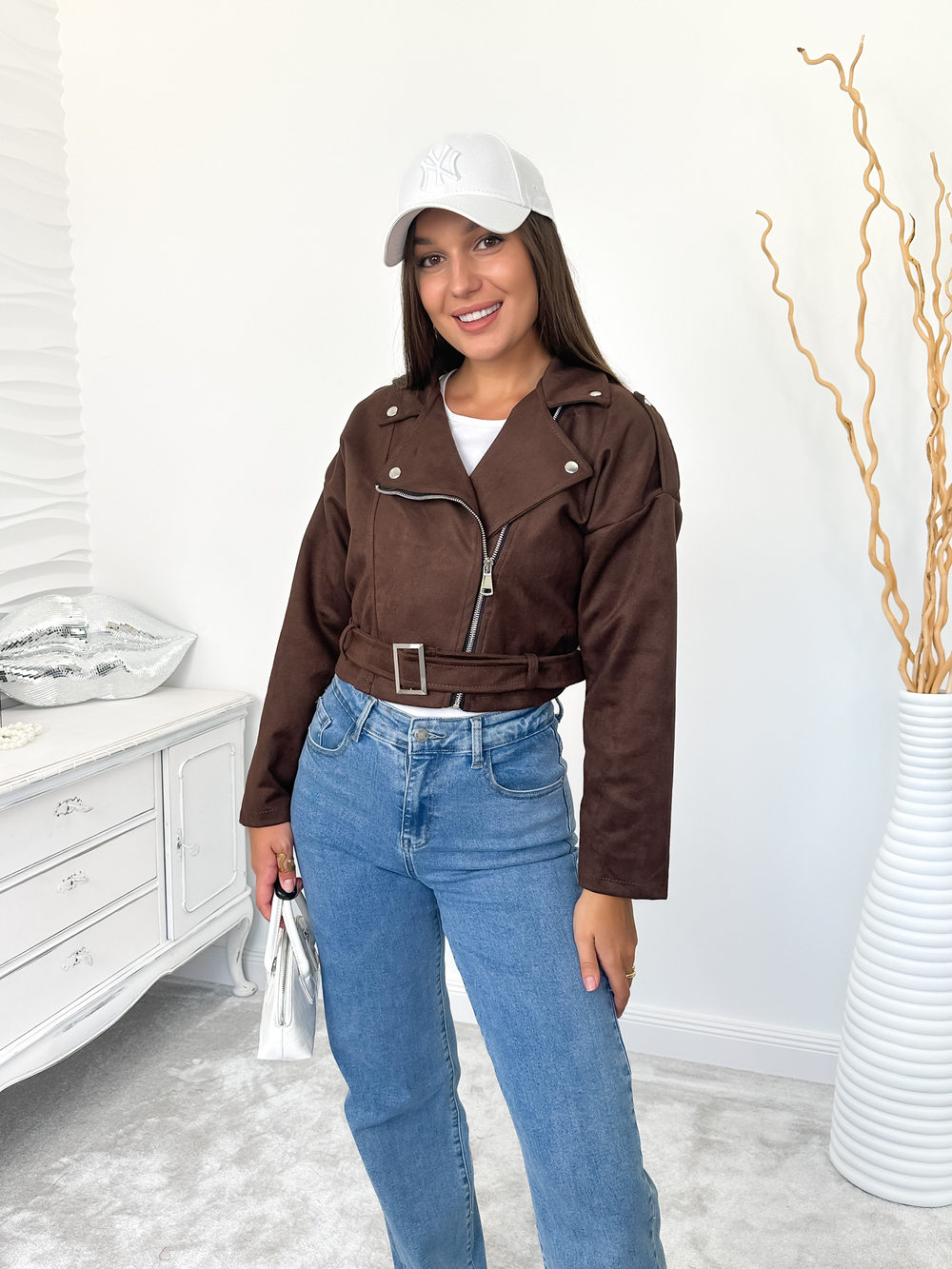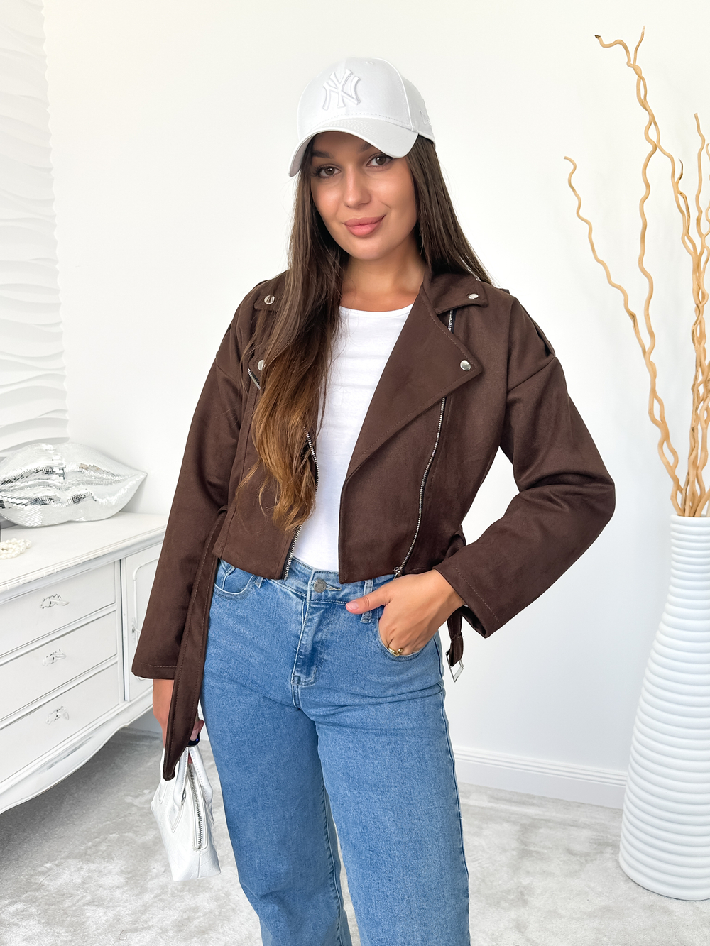 Zamszowa kurtka typu ramoneska to ponadczasowy model, który doda charakteru każdej stylizacji. Zapinana na zamek, z paskiem na dole i ozdobnymi dżetami, łączy elegancję z nutą rockowego stylu. Idealna zarówno na co dzień, jak i na wyjątkowe okazje.