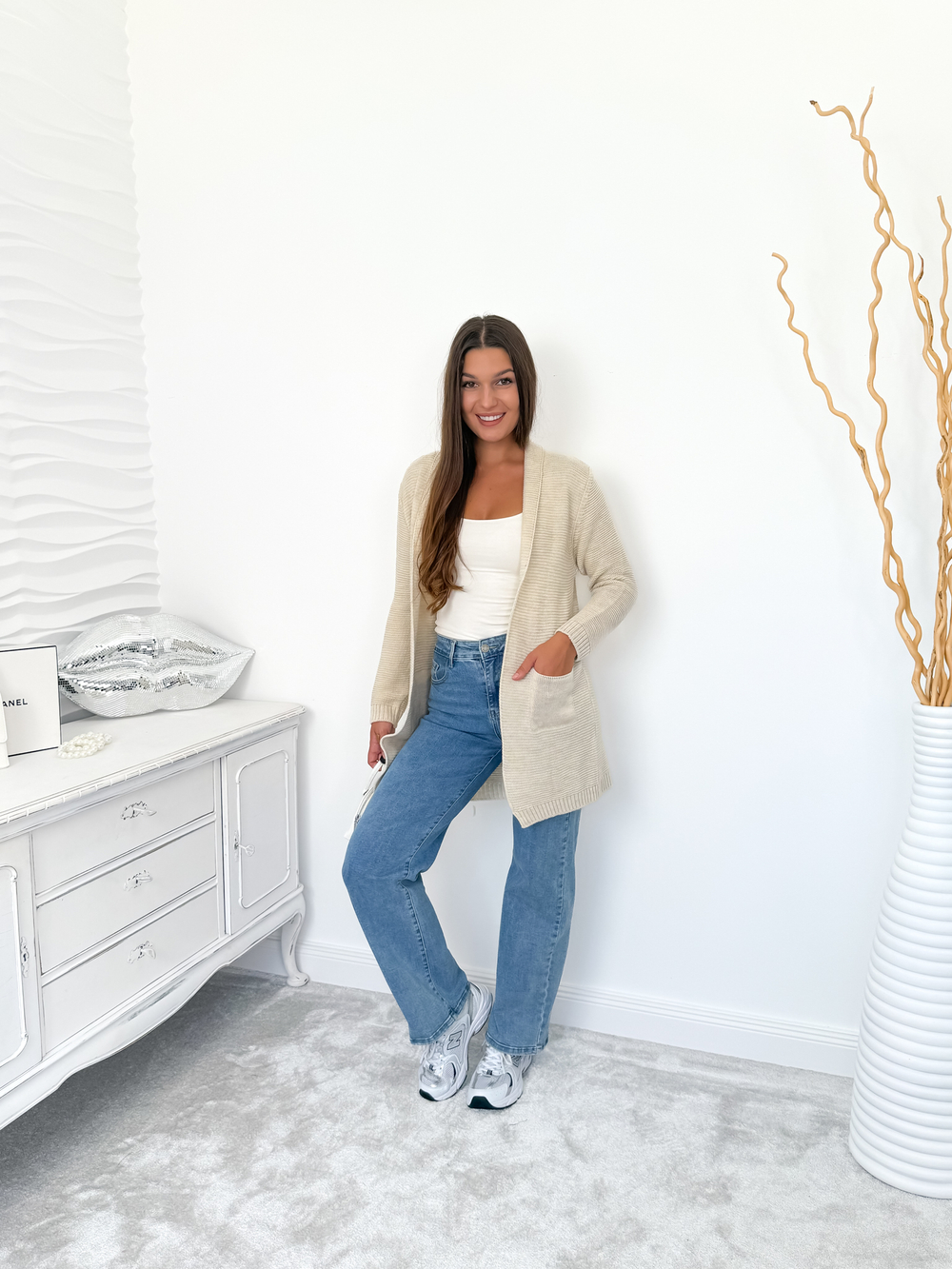 Klasyczny kardigan o długości do połowy uda to idealny wybór na chłodniejsze dni. Wykonany z lekko plecionego materiału, jest wygodny i przyjemny w noszeniu. Dwie praktyczne kieszenie dodają mu funkcjonalności i codziennego uroku.