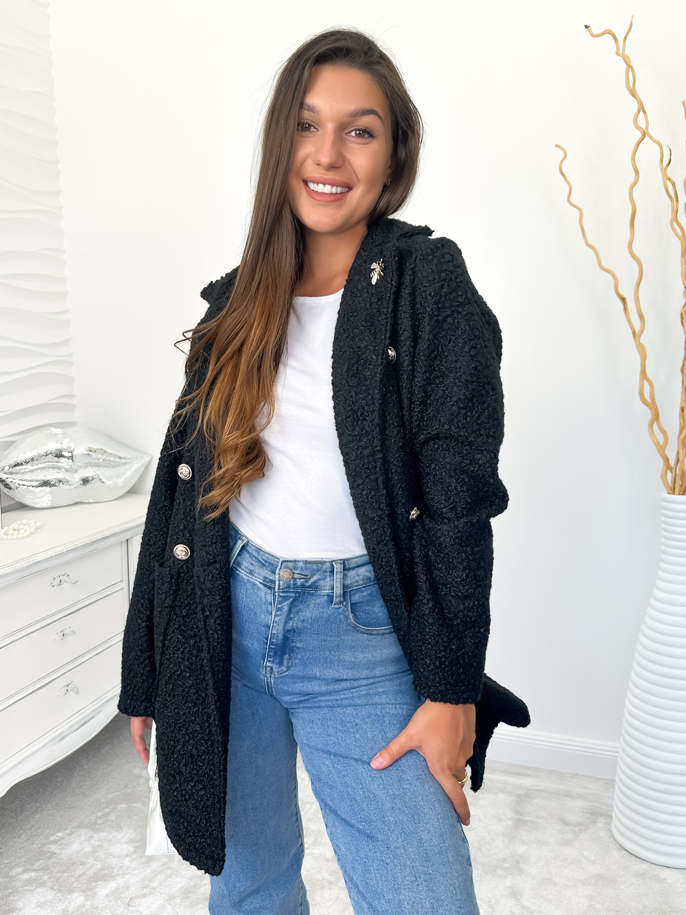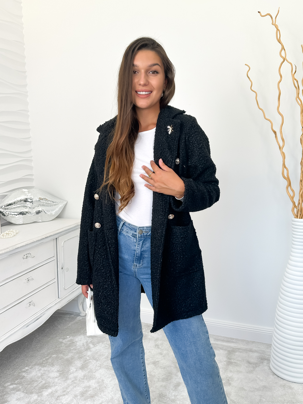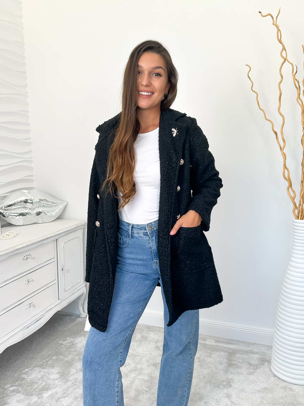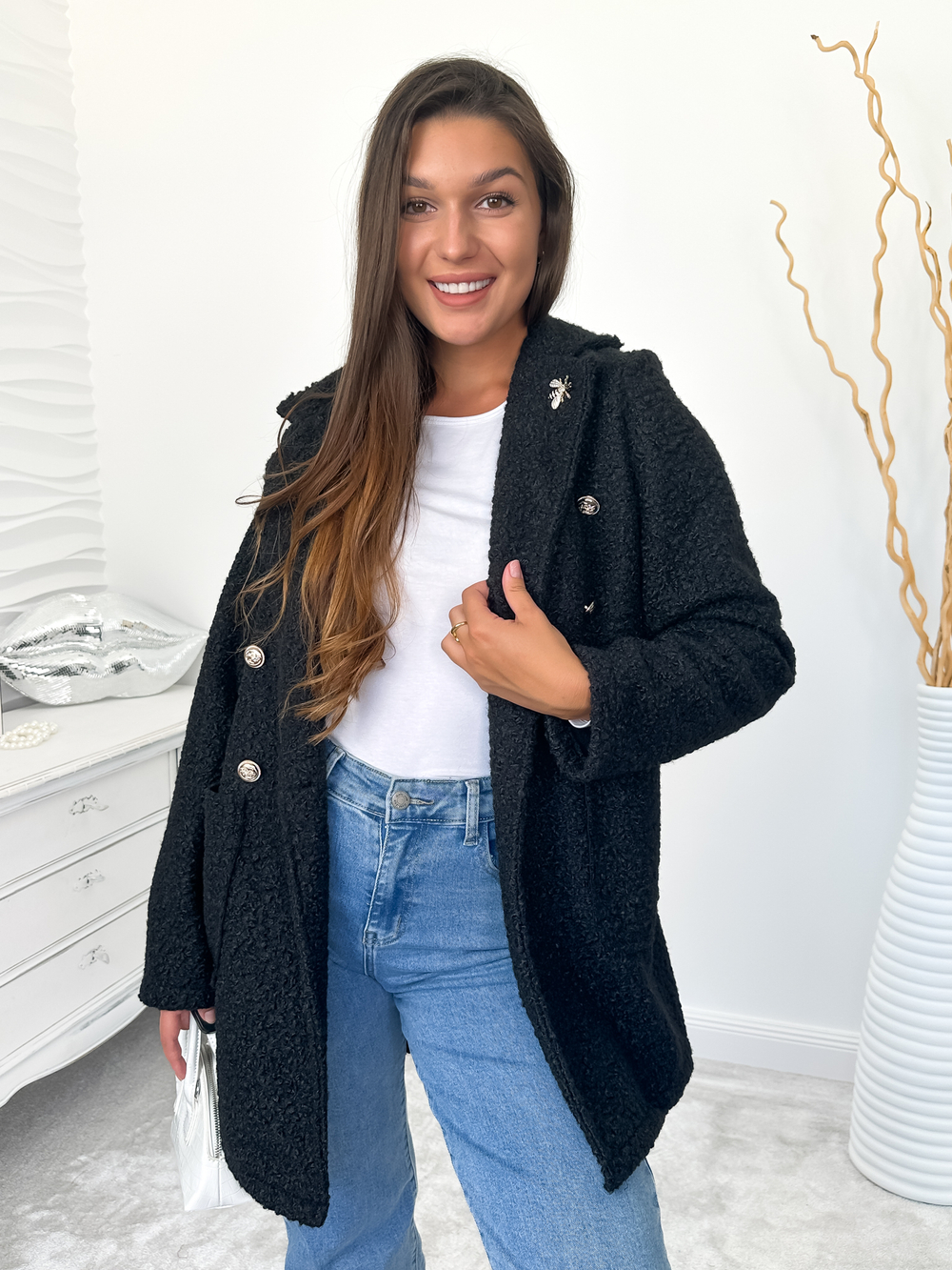 Klasyczny płaszcz o długości do połowy uda, wykonany z lekkiego, miękkiego materiału o strukturze baranka. Zapinany na jeden guzik, z ozdobnymi złotymi guzikami, dwiema głębokimi kieszeniami i broszką na klapie (z możliwością odpięcia). Wygodny, przejściowy model bez podszewki – idealny na chłodniejsze dni.