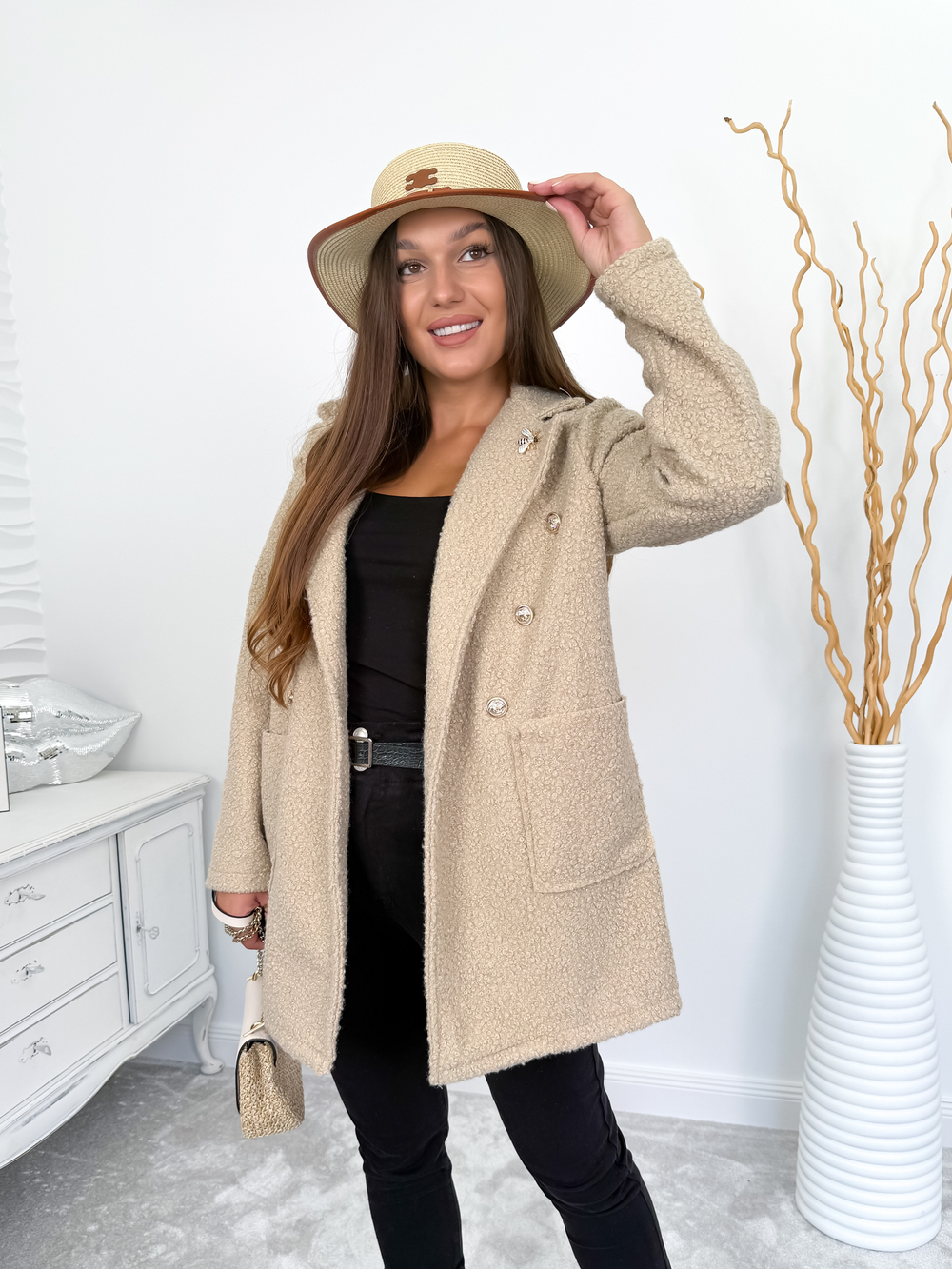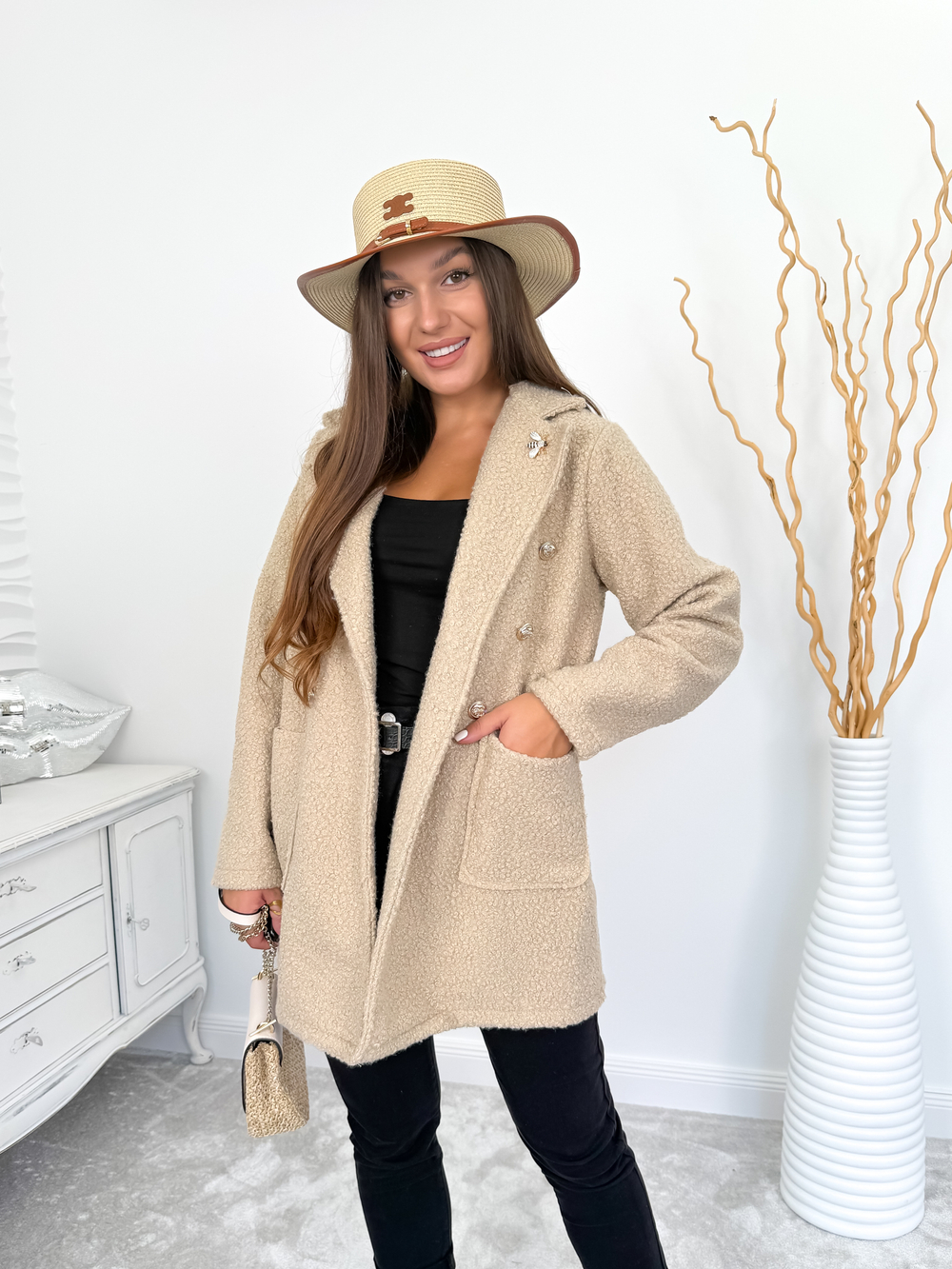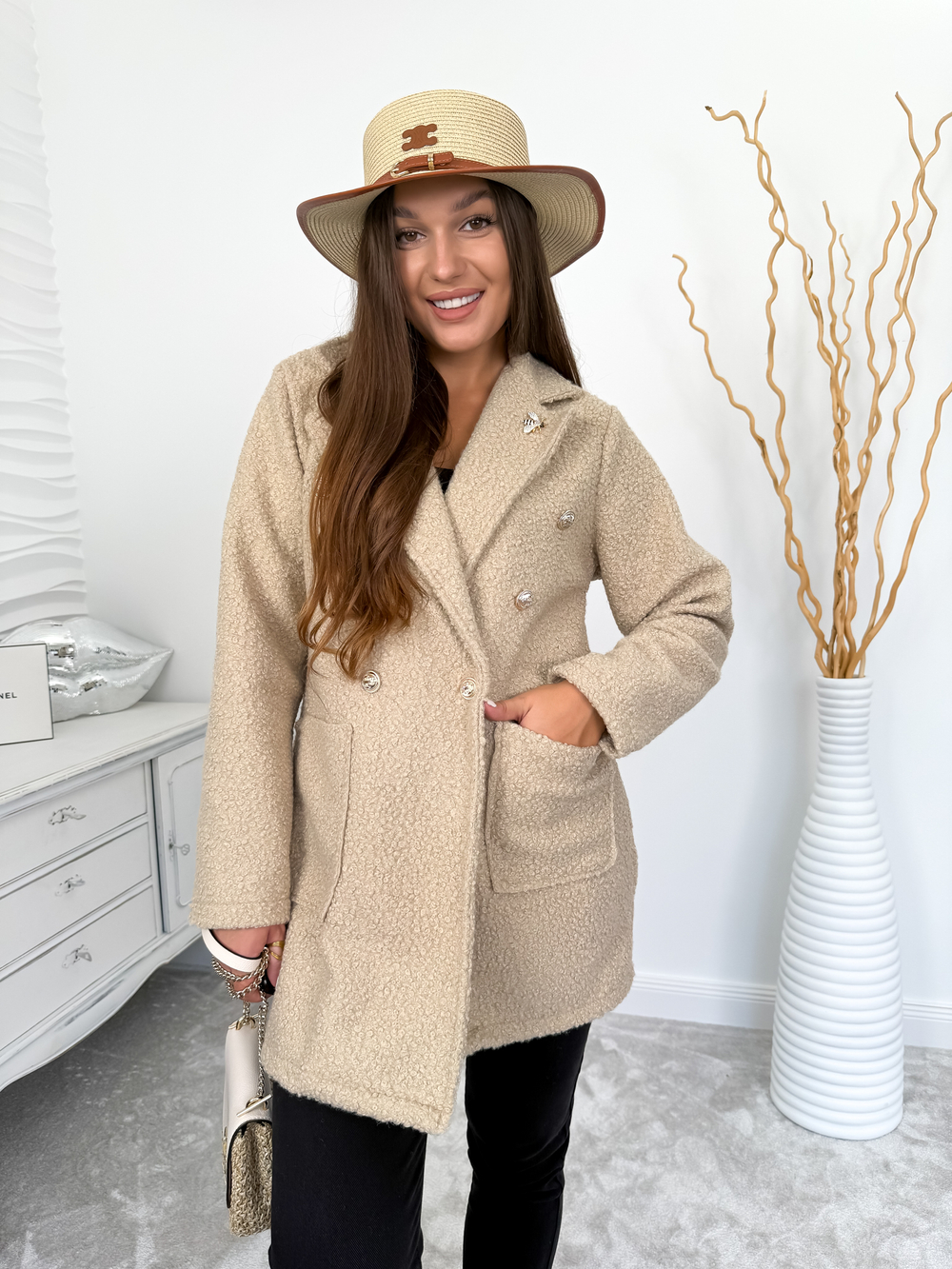 Klasyczny płaszcz o długości do połowy uda, wykonany z lekkiego, miękkiego materiału o strukturze baranka. Zapinany na jeden guzik, z ozdobnymi złotymi guzikami, dwiema głębokimi kieszeniami i broszką na klapie (z możliwością odpięcia). Wygodny, przejściowy model bez podszewki – idealny na chłodniejsze dni.