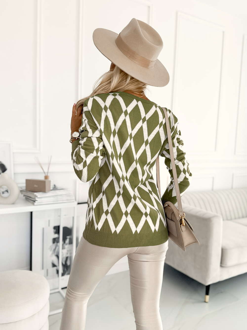 Zjawiskowy kardigan w wyjątkowy wzór w romby to idealne połączenie klasyki i stylu. Zapinany na guziki, wygodny i miękki, sprawdzi się jako uniwersalny element garderoby. Doskonały zarówno do eleganckich, jak i codziennych stylizacji.