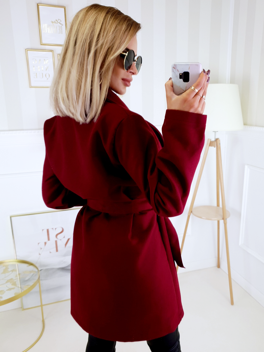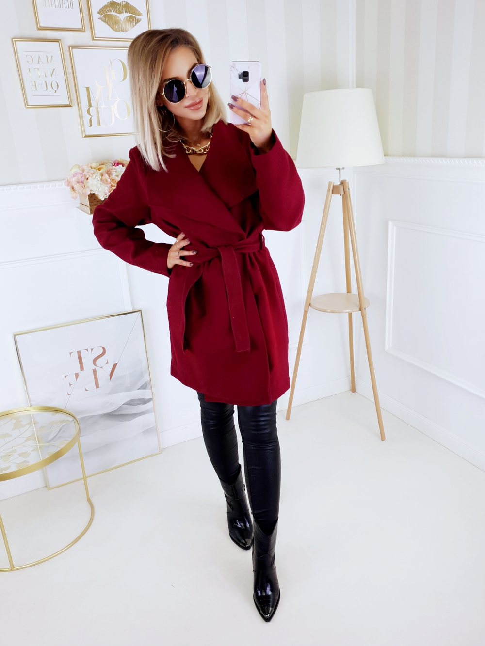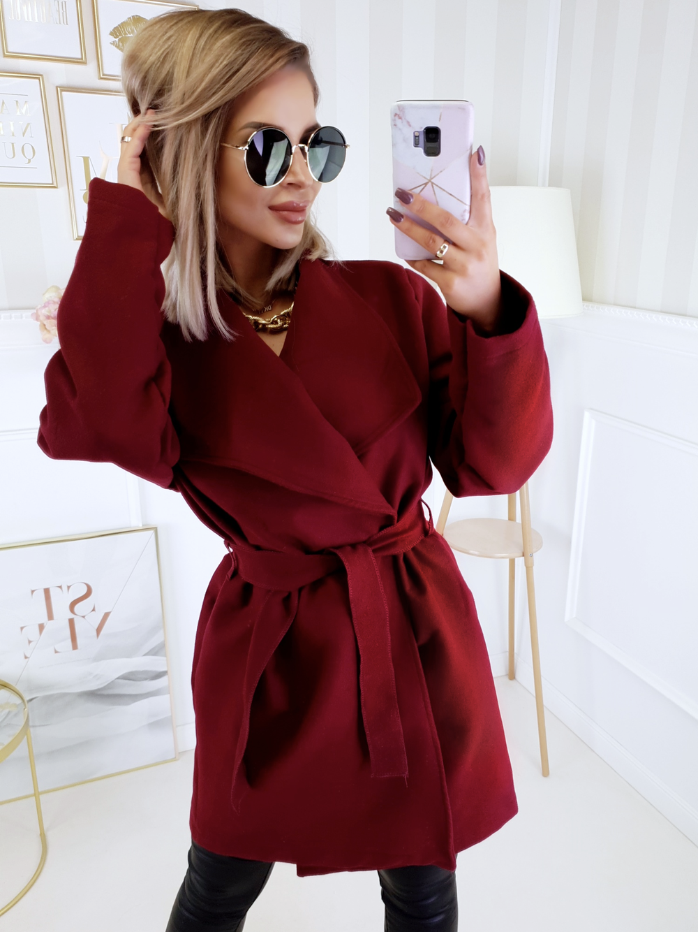 Klasyczny płaszcz z miękkiego, flauszowego materiału, idealny na sezon przejściowy. W talii wiązany paskiem, z dużym, wywijanym kołnierzem. Bez podszewki i kieszeni, prezentuje się elegancko i kobieco.