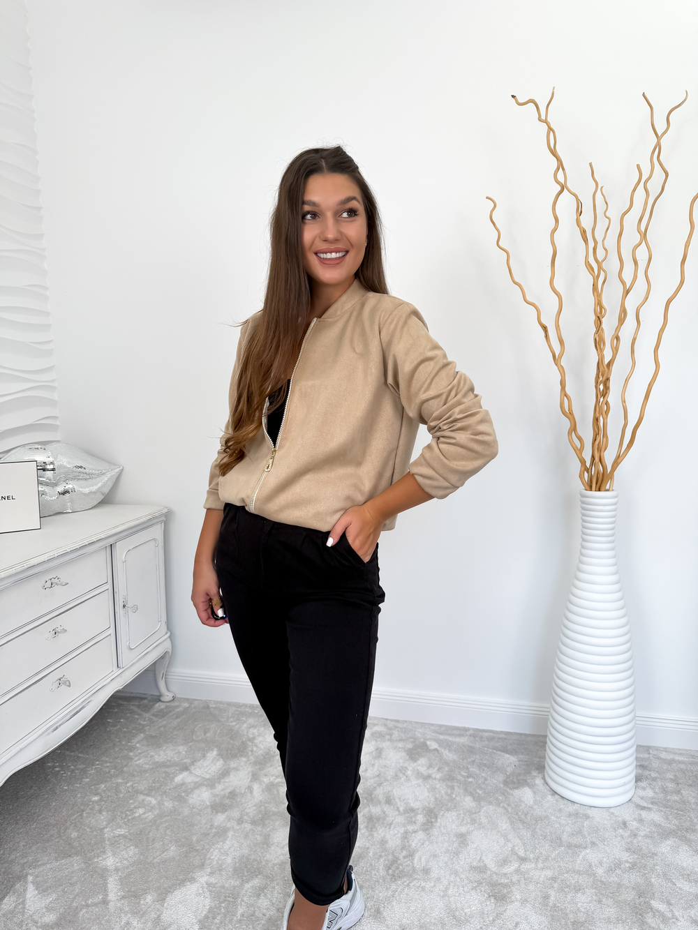 Beżowa zamszowa kurtka bomberka z ozdobnym zamkiem