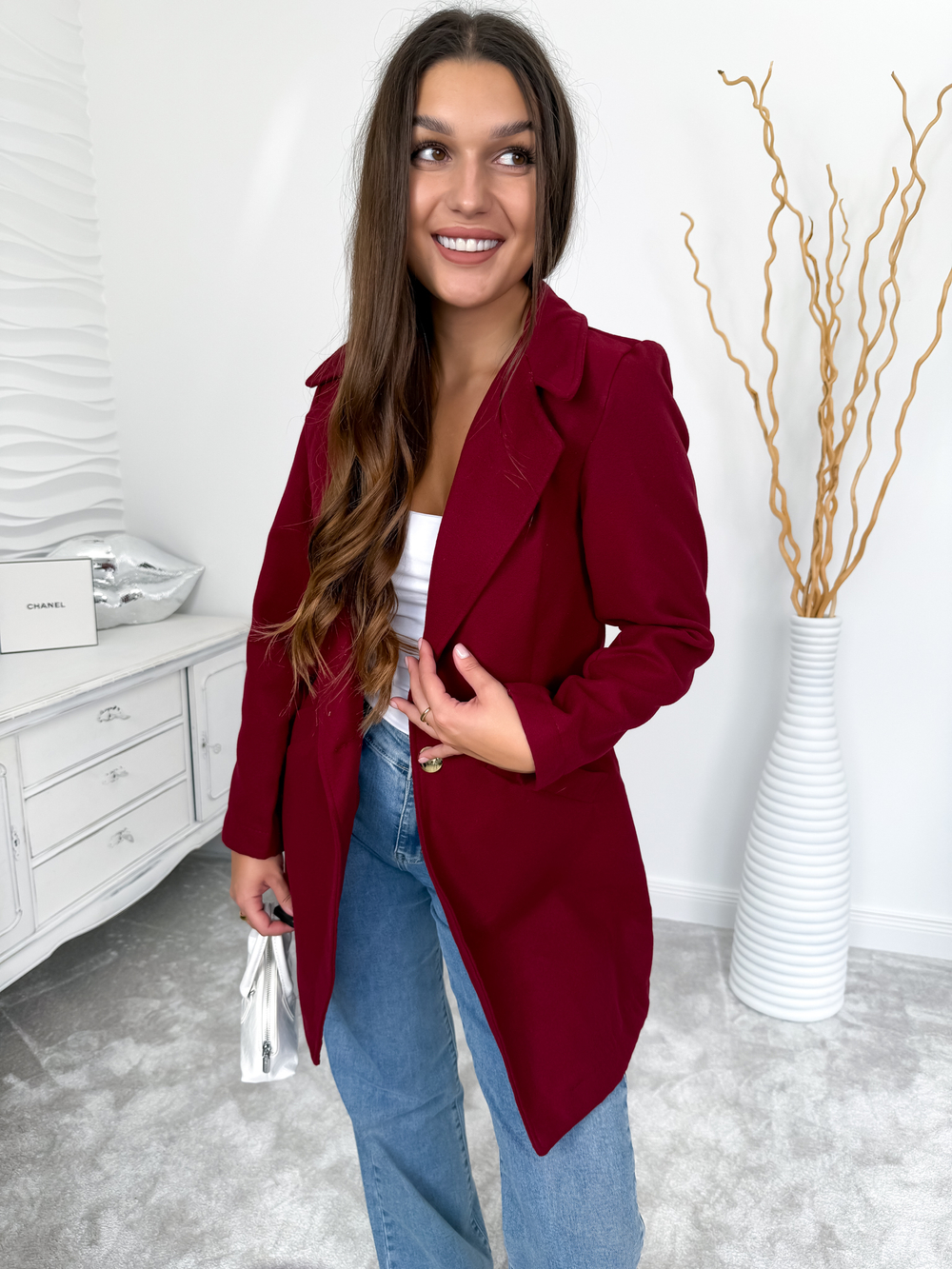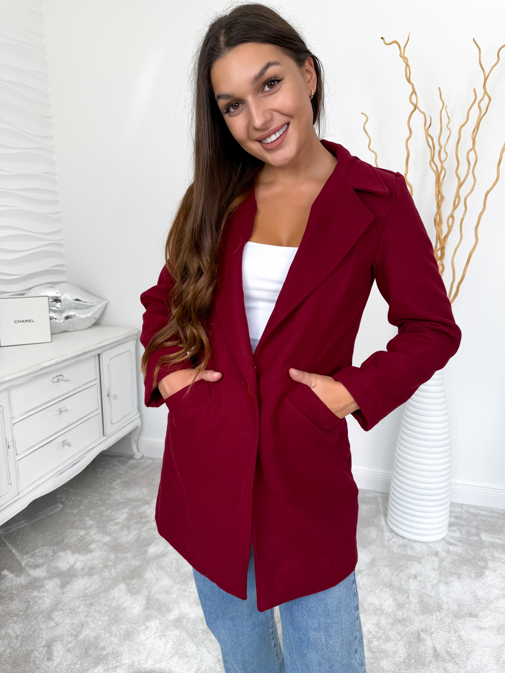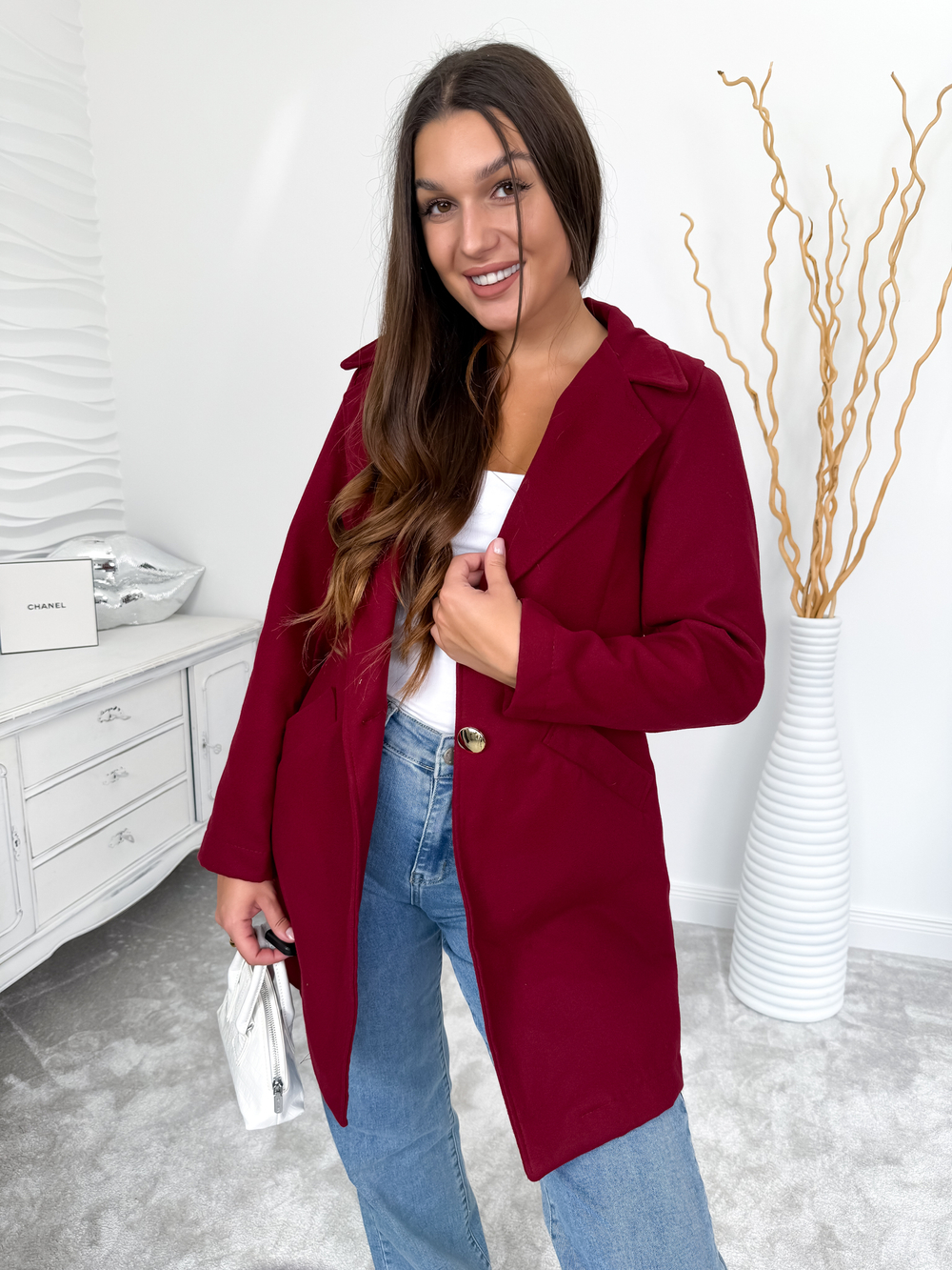 Bordowy płaszcz ze złotym guzikiem