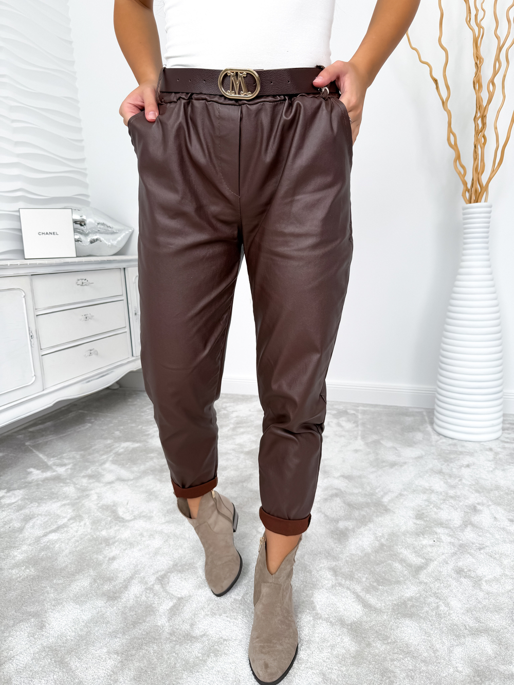 Woskowane spodnie typu boyfriend wykonane z elastycznego materiału to idealne połączenie wygody i stylu. Dzięki możliwości podwinięcia nogawek możesz dopasować je do różnych stylizacji. W zestawie pasek, który podkreśla talię i dodaje całości charakteru.
