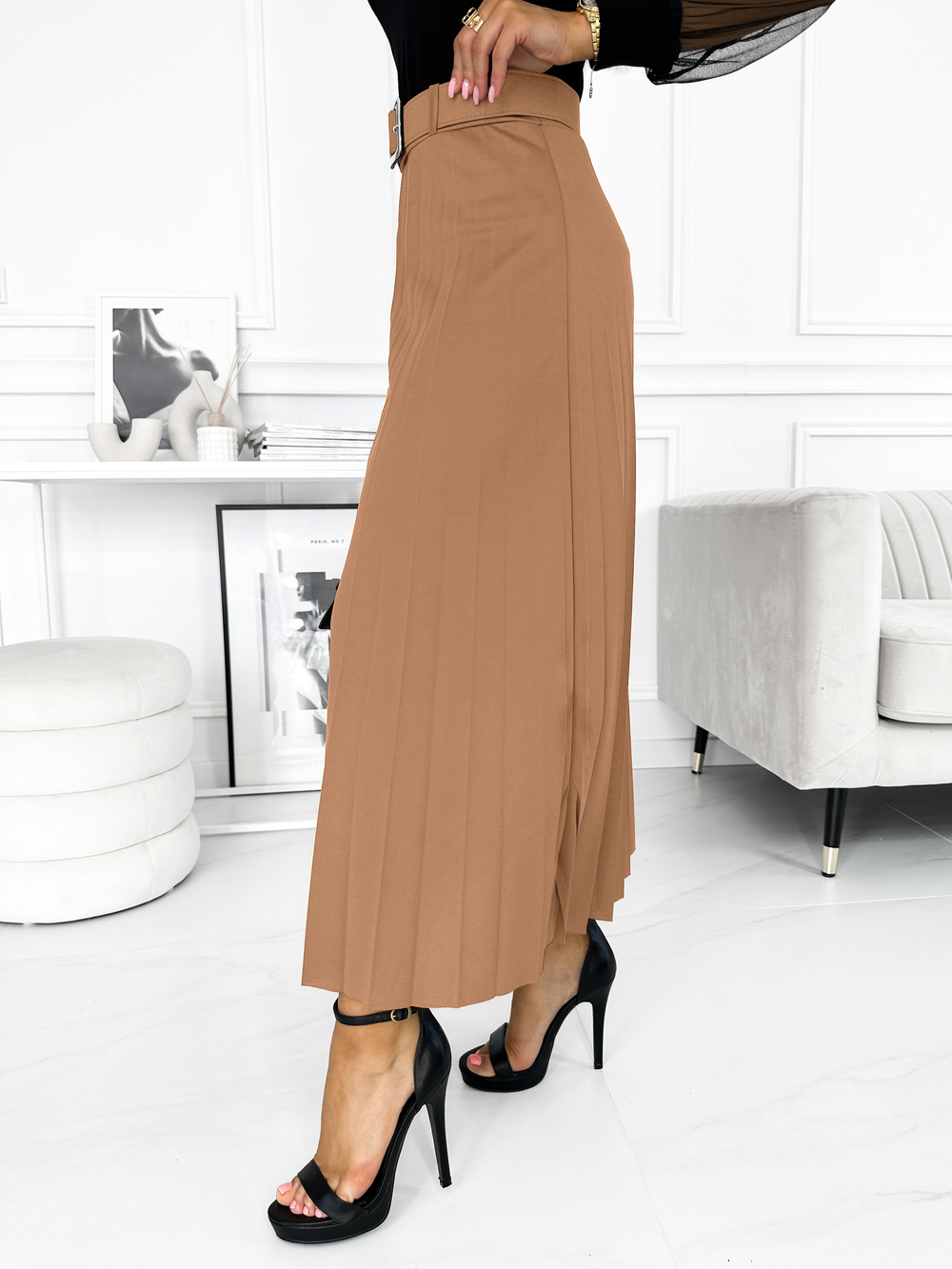 Elegancka plisowana spódnica midi z elastyczną gumką w talii, bez podszewki, z dołączonym paskiem. Dół cięty laserowo bez dodatkowych szwów nadaje nowoczesnego charakteru. Wygodna, lekka i idealna do codziennych oraz eleganckich stylizacji.
