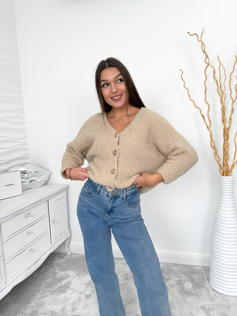 Ciepły, miękki sweterek zapinany na ozdobne, złote guziki to połączenie elegancji i wygody. W składzie znajduje się moher, który nadaje mu puszystości i przyjemnego ciepła. Stylowy i komfortowy – idealny na chłodniejsze dni.