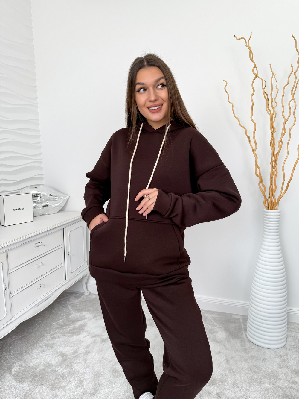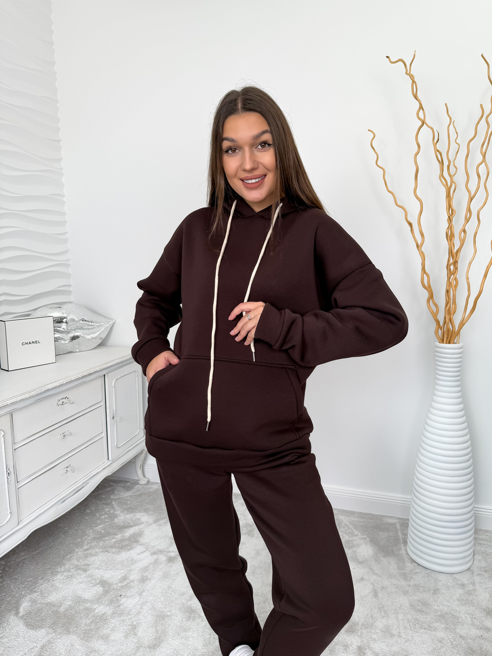 Ciepły i wygodny komplet dresowy składający się z bluzy z kapturem oraz spodni z elastyczną gumką i wiązanym troczkiem w pasie. Miękki materiał zapewnia komfort noszenia, a klasyczny fason sprawia, że zestaw idealnie sprawdzi się na co dzień. Stylowy i praktyczny – doskonały wybór na chłodniejsze dni.