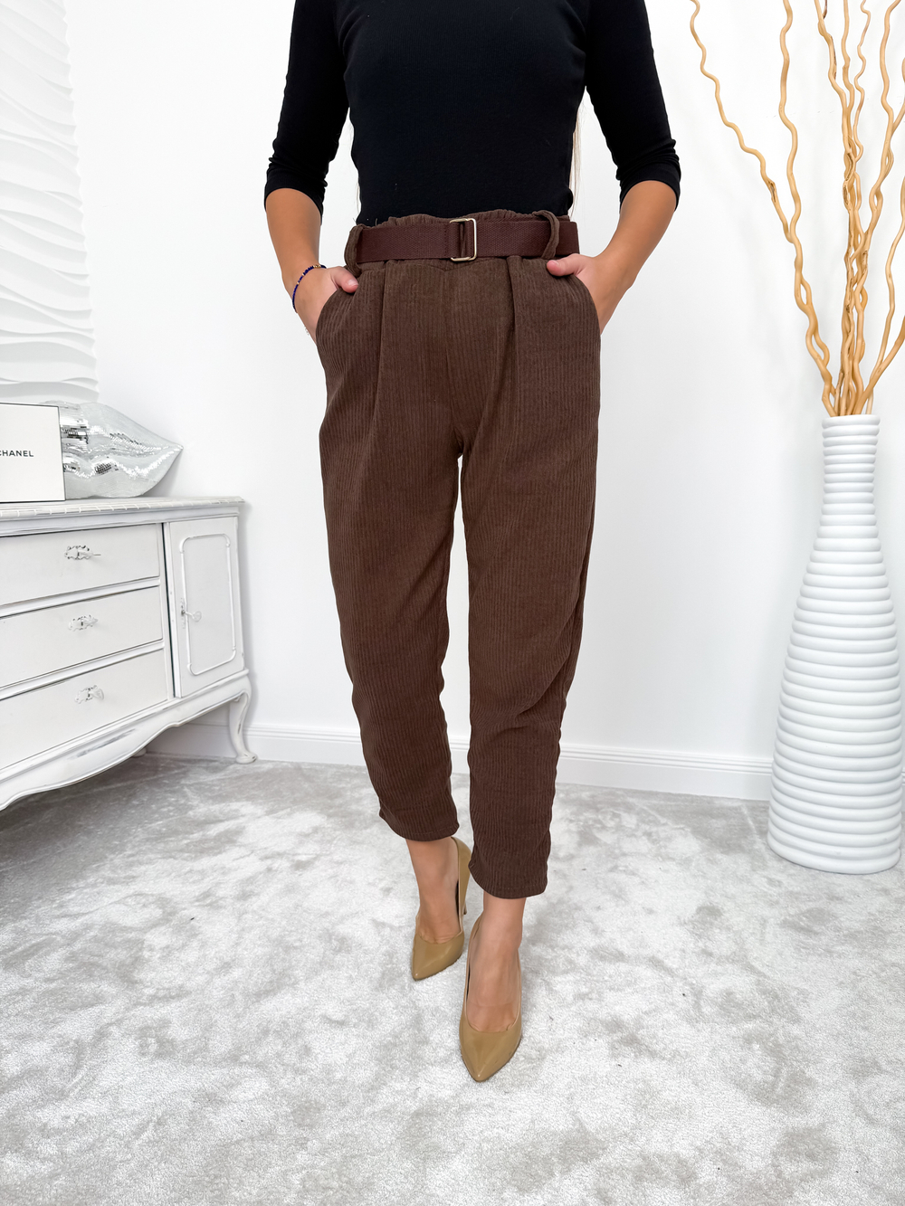 Sztruksowe, elastyczne spodnie z paskiem to idealne połączenie wygody i stylu. Mają długość do kostki, średni stan oraz dwie praktyczne kieszenie. Świetne na co dzień i do pracy.