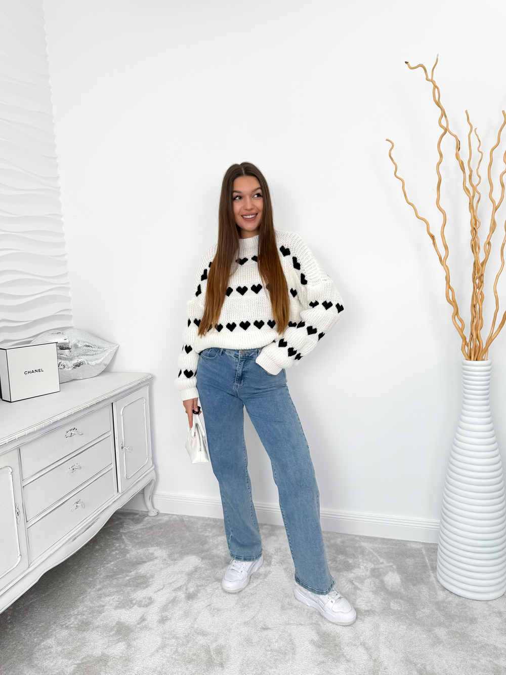 Uroczy, ciepły sweterek o grubym splocie z motywem serduszek to idealny wybór na chłodniejsze dni. Luźny krój zapewnia komfort noszenia, a ściągacze na rękawach i dole dodają mu kształtu. Wygodny, miękki i w rozmiarze uniwersalnym — pasuje do wielu stylizacji i sylwetek.