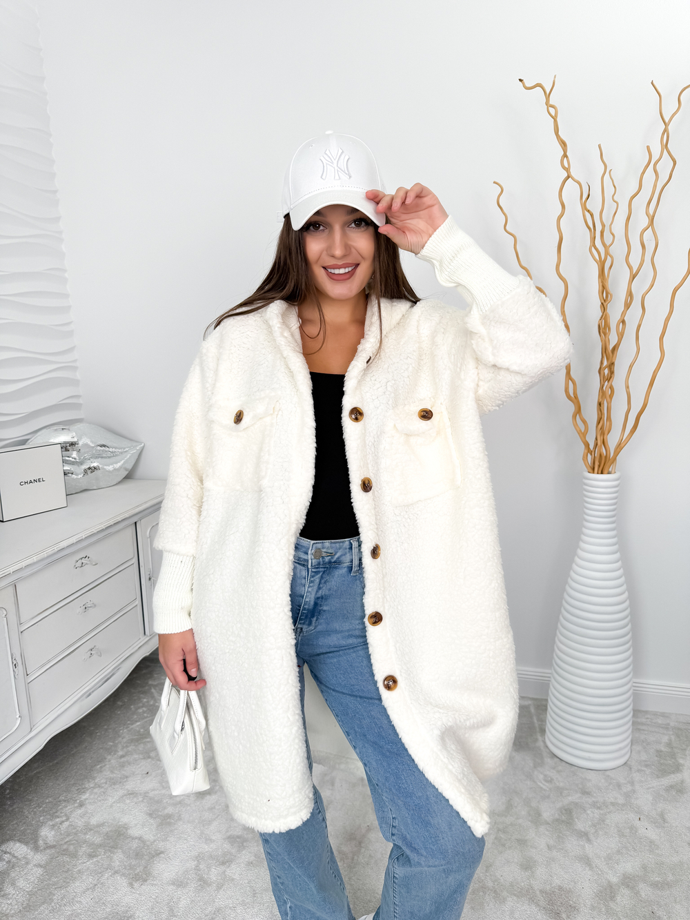 Stylowy płaszcz typu baranek z kapturem to idealna propozycja na chłodniejsze dni. Wykonany z miękkiego materiału z domieszką bawełny, zapewnia ciepło i wygodę bez zbędnej podszewki. Model zapinany jest na guziki, co podkreśla jego klasyczny charakter.
