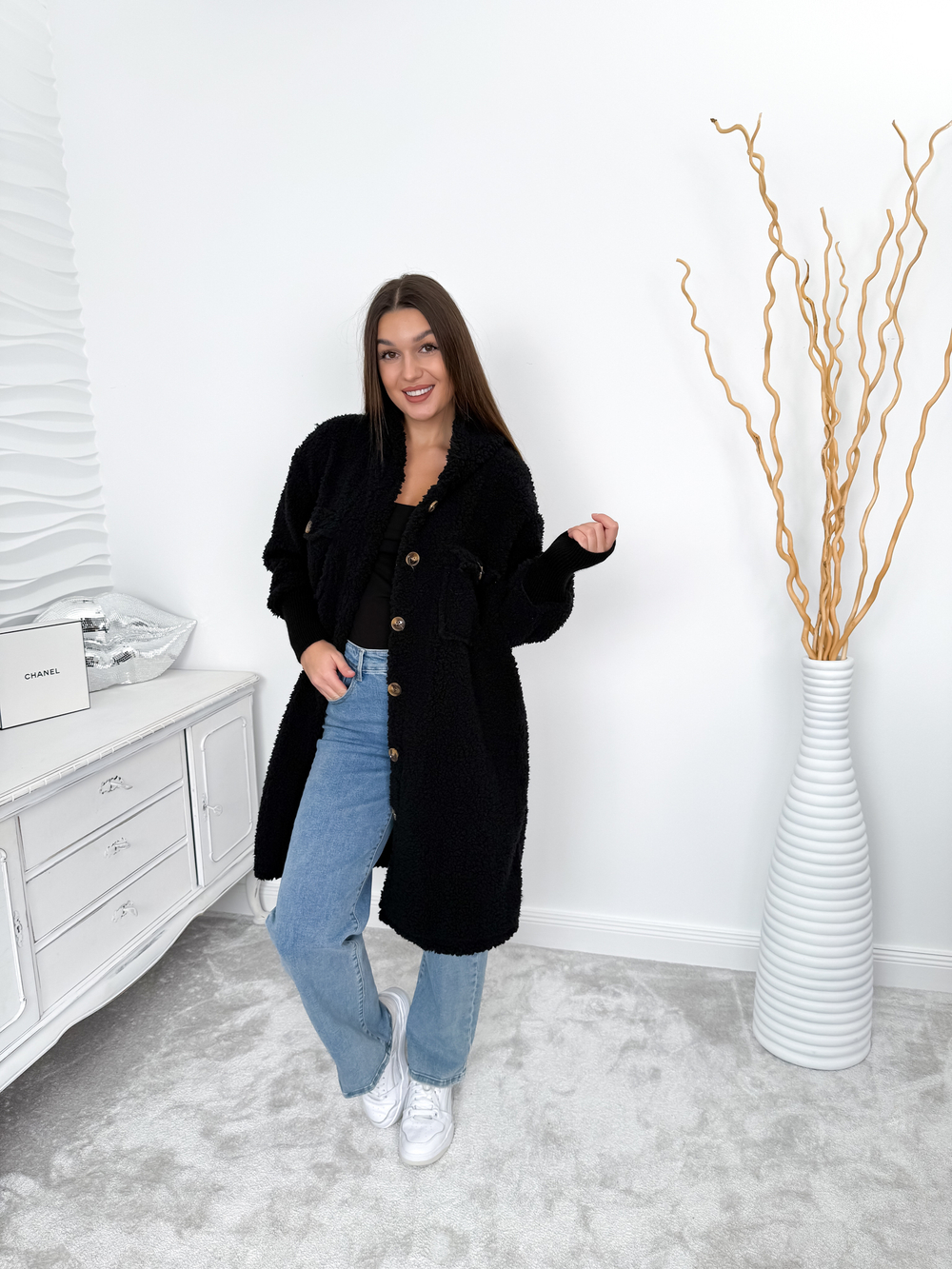 Stylowy płaszcz typu baranek z kapturem to idealna propozycja na chłodniejsze dni. Wykonany z miękkiego materiału z domieszką bawełny, zapewnia ciepło i wygodę bez zbędnej podszewki. Model zapinany jest na guziki, co podkreśla jego klasyczny charakter.