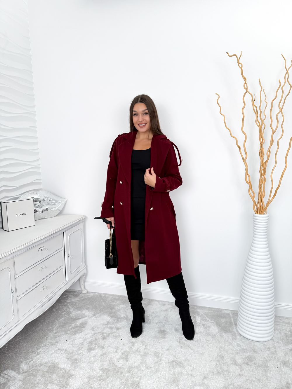 Piękny płaszcz z eleganckiego materiału w jodełkę ma złote guziki i wiązany pasek podkreślający talię. Posiada podszewkę i z tyłu ozdobną naszywkę. Idealny na stylowe, jesienne stylizacje.